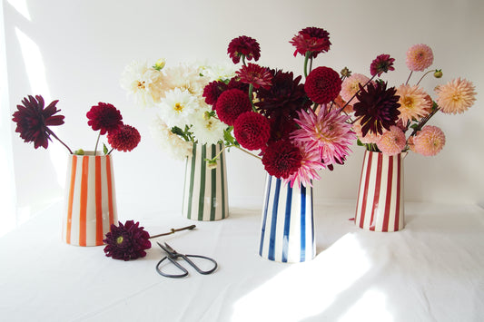 Multi-functional flower bowls and jars for arranging at home, soap dishes, candle stick holders, porcelain tealight holders and botanical tiles by artist Rachel Dein.