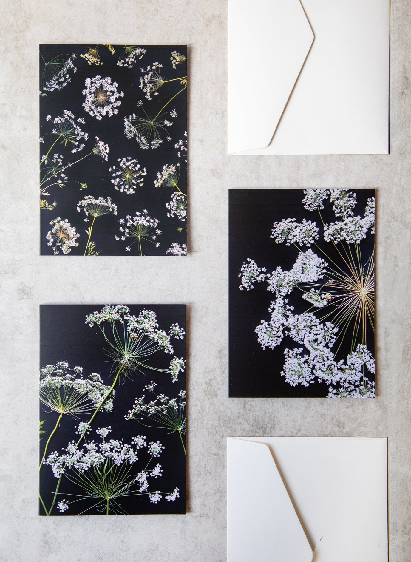 Our set of three printed cards featuring striking designs of pressed ammi majus flowers silhouetted against a sleek black background.