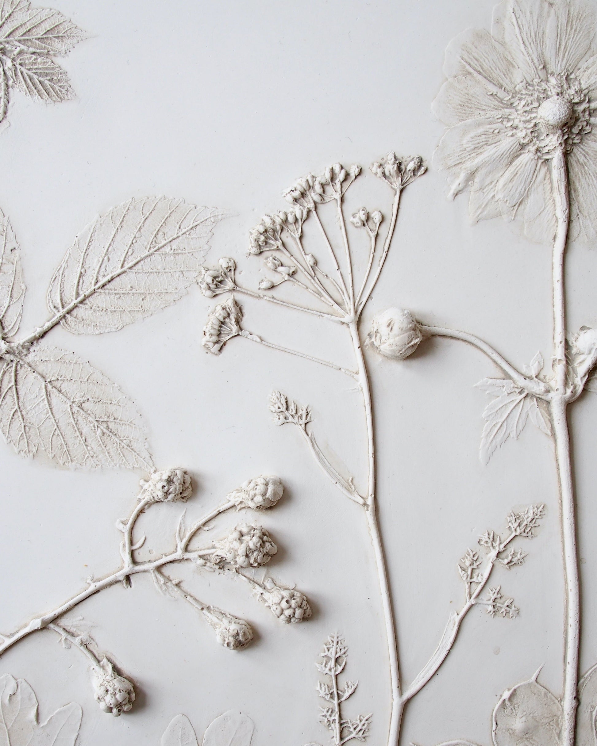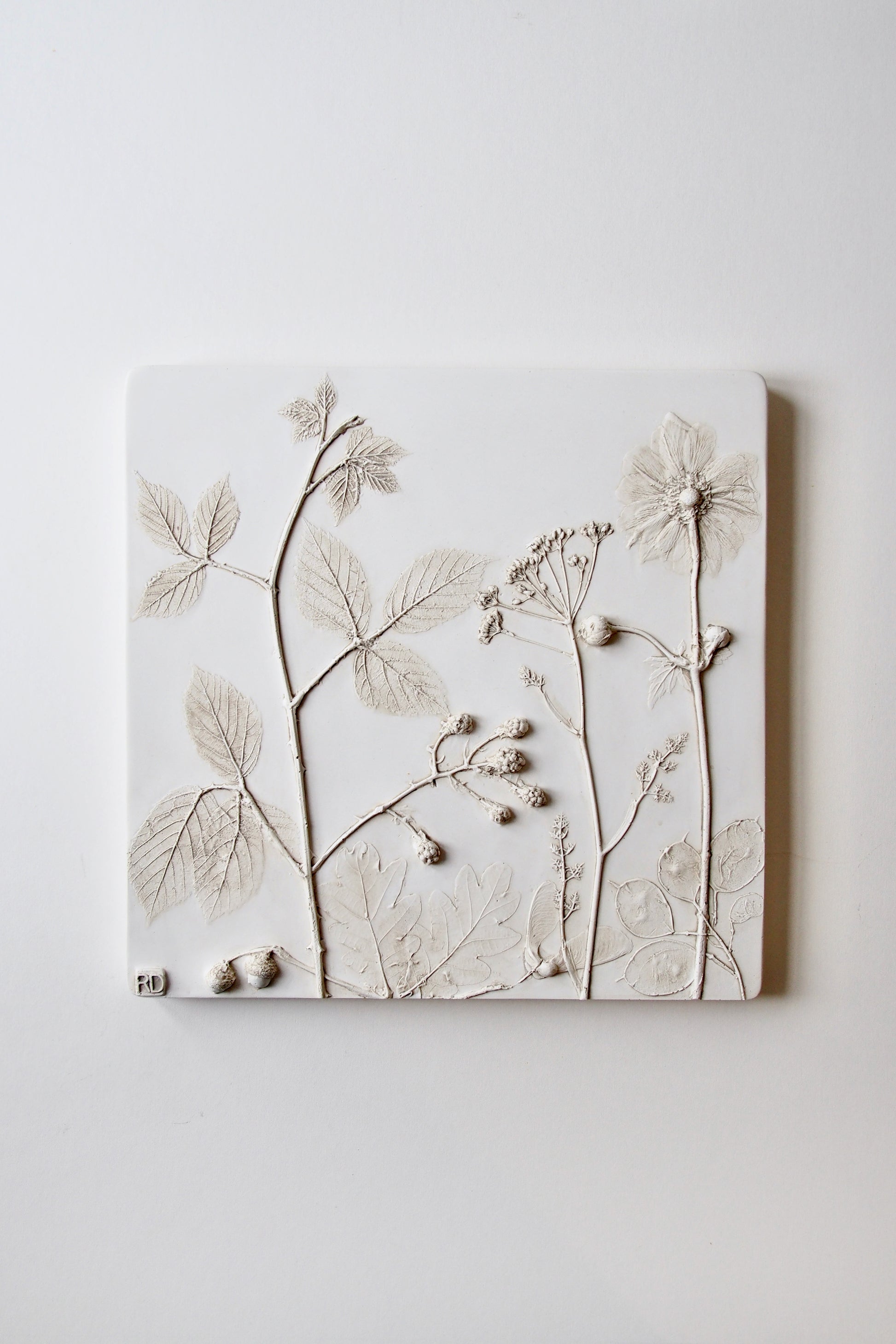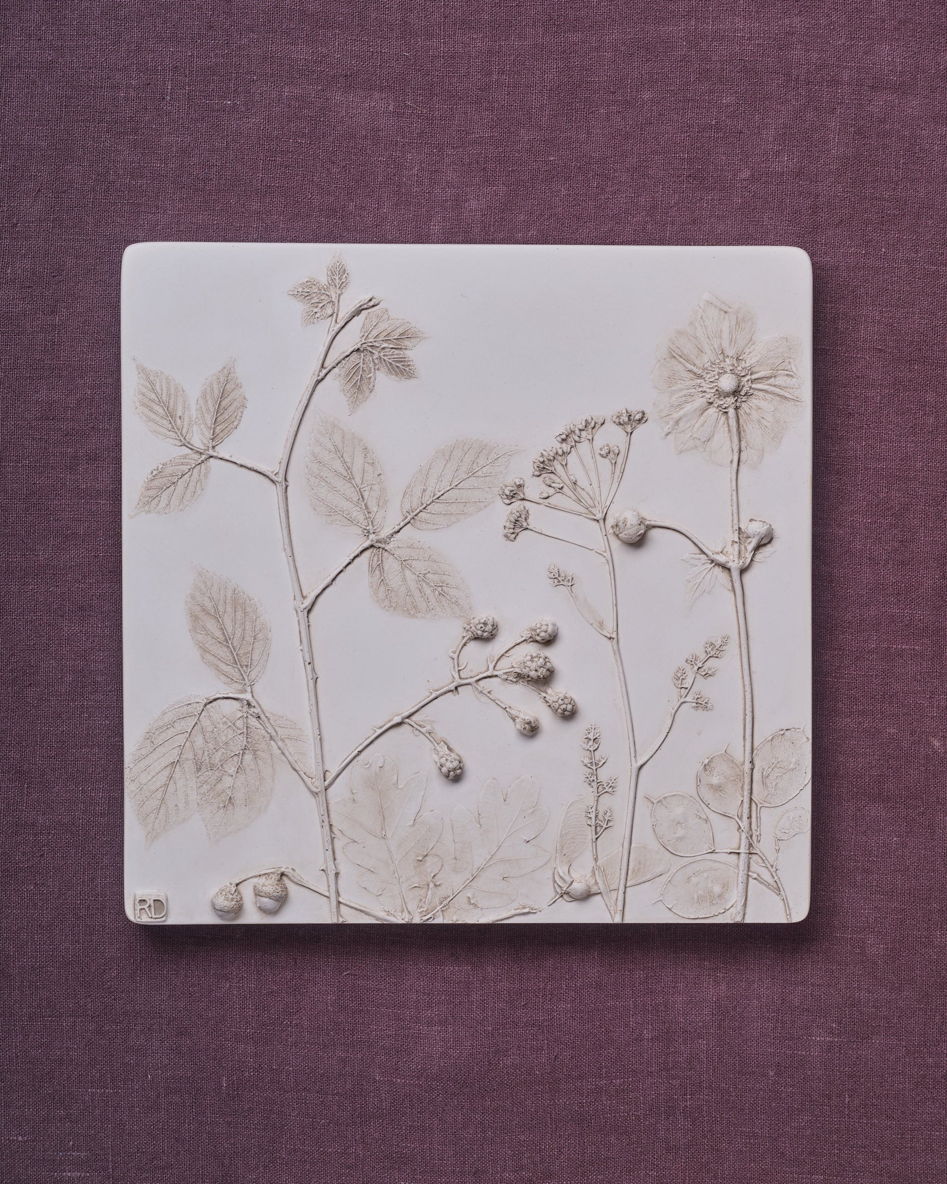 A large ceramic tile depicting seasonal autumn flowers cast in plaster. As huge admirers of Rachel Dein's work, we were thrilled when she agreed to collaborate with us on a series of bespoke botanical relief artworks depicting the changing seasons.