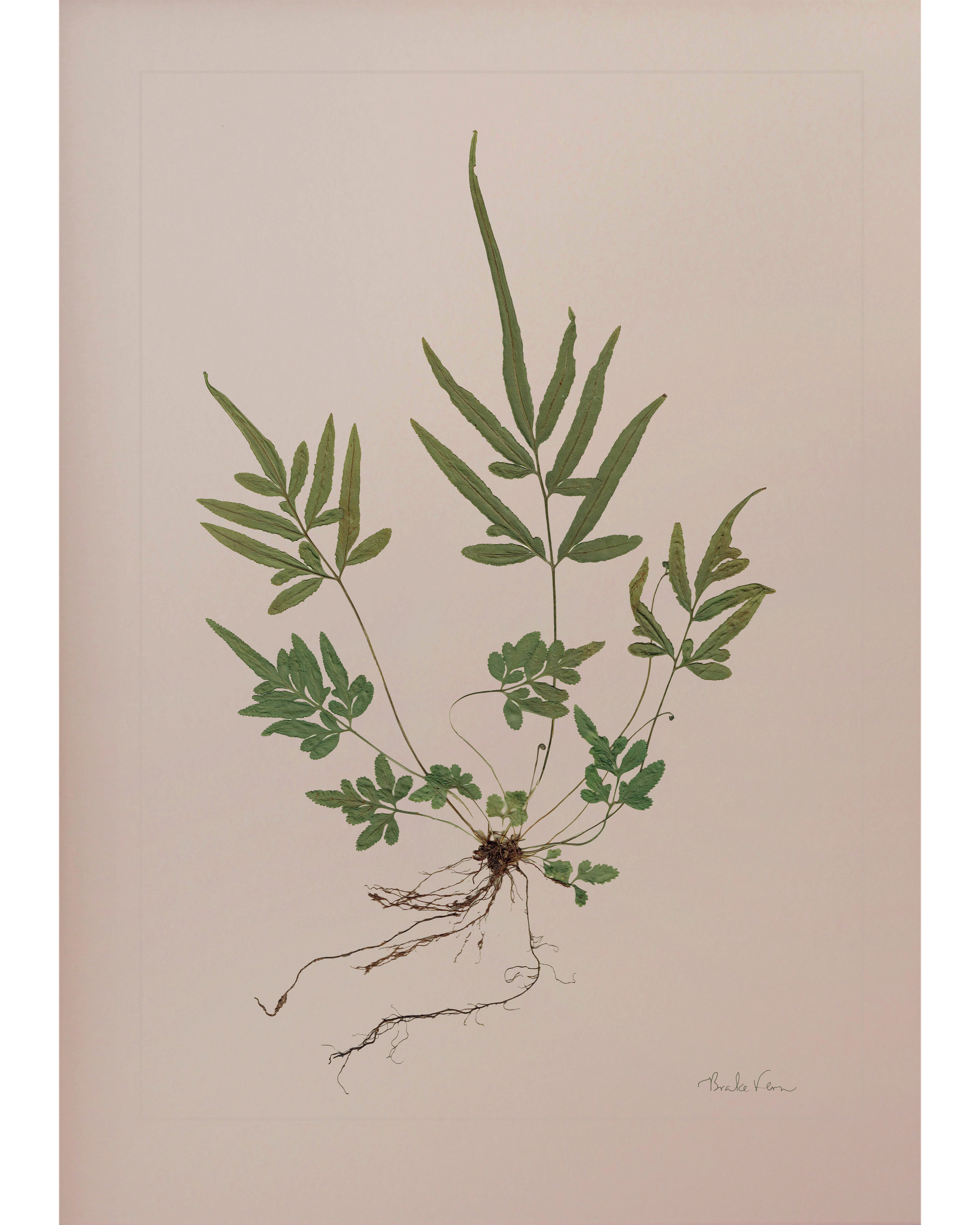 Brake Fern: pressed at our London studio using traditional methods, mounted on parchment 1400 micron board. This specimen is set within a scored border, with its plant name in calligraphy.