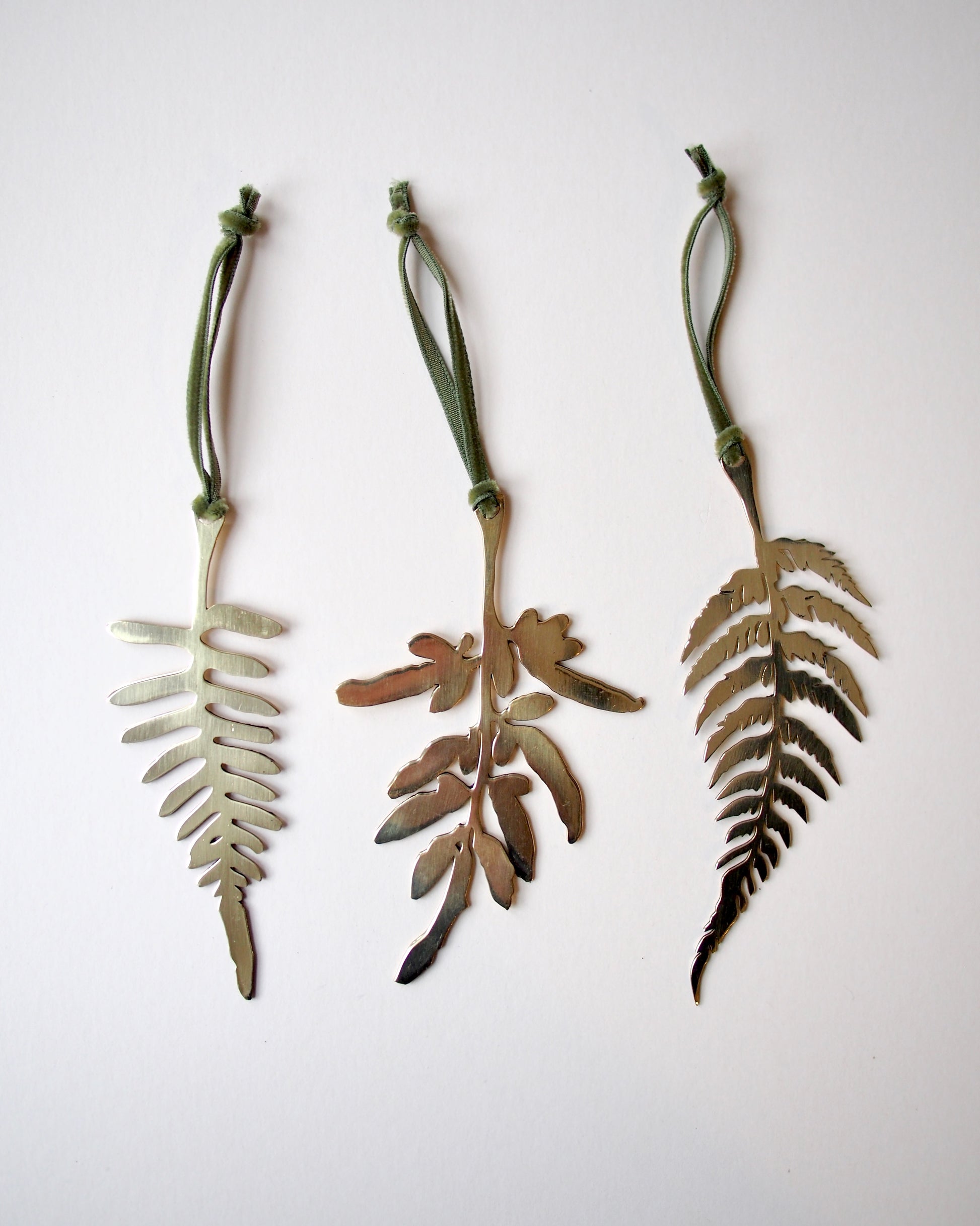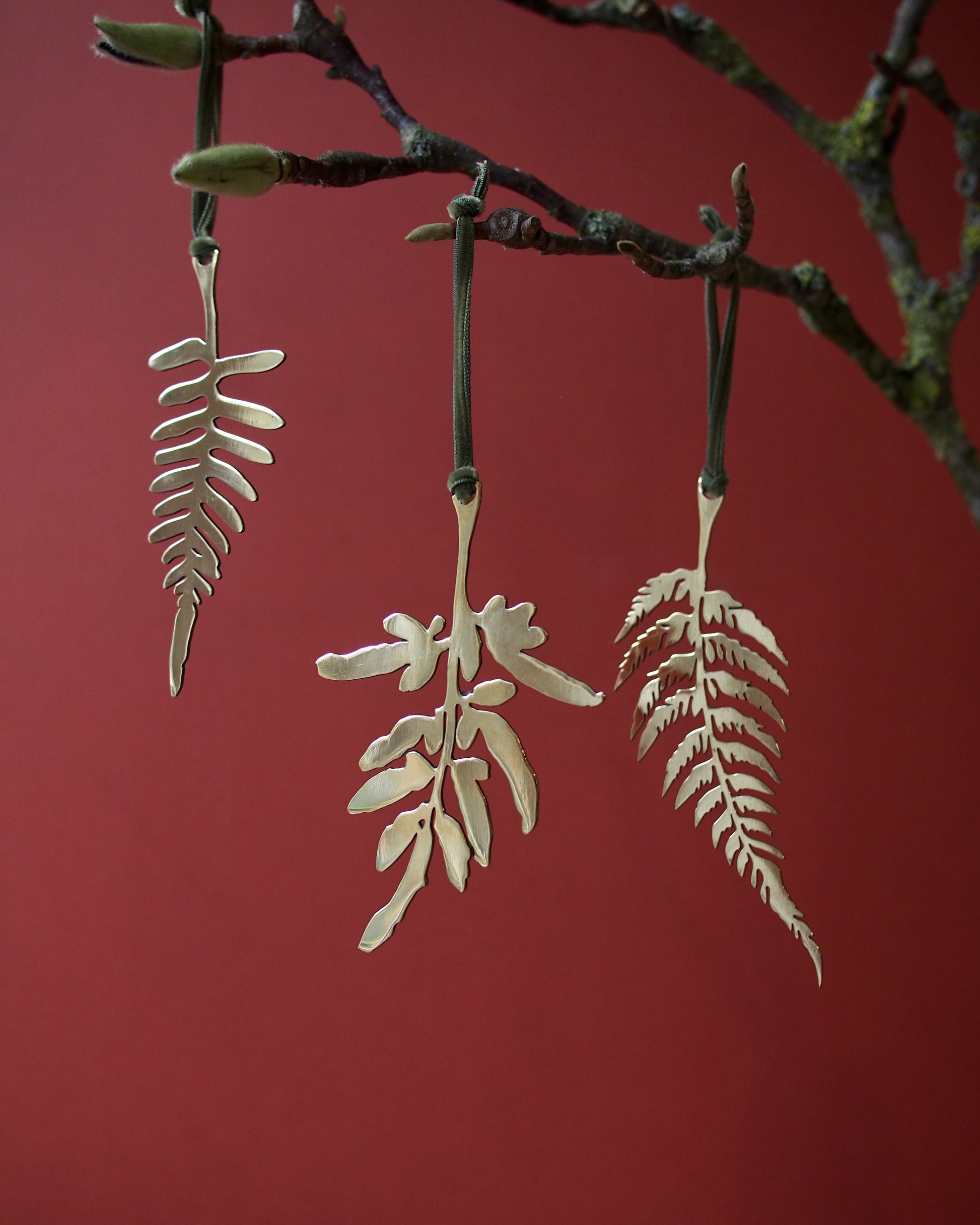 A set of three solid brass ornaments crafted from our favourite fern pressings, each one chosen for its unique shape and silhouette. These timeless ornaments are perfect for gifting or cherishing as year round adornments in your home.