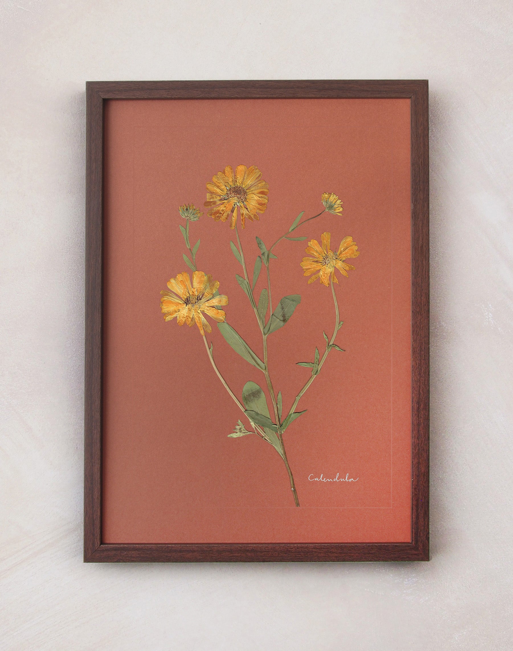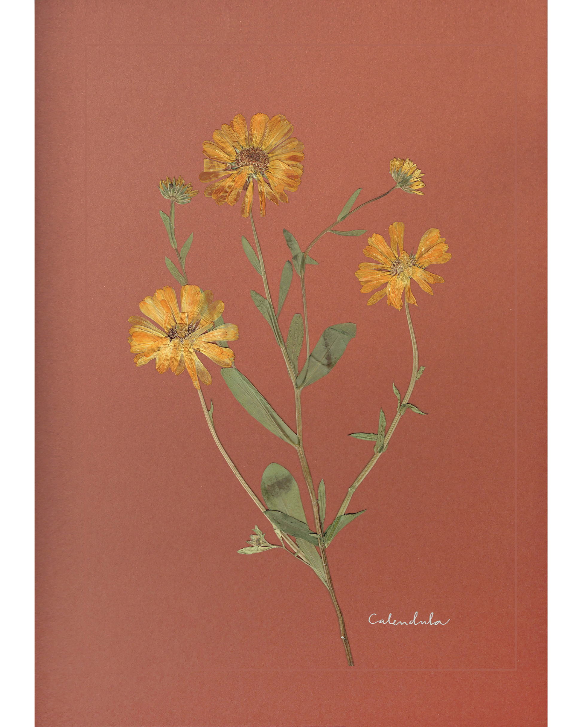 Calendula: pressed at our London studio using traditional methods, mounted on rust 1400 micron board. This specimen is set within a scored border, with its plant name in calligraphy.