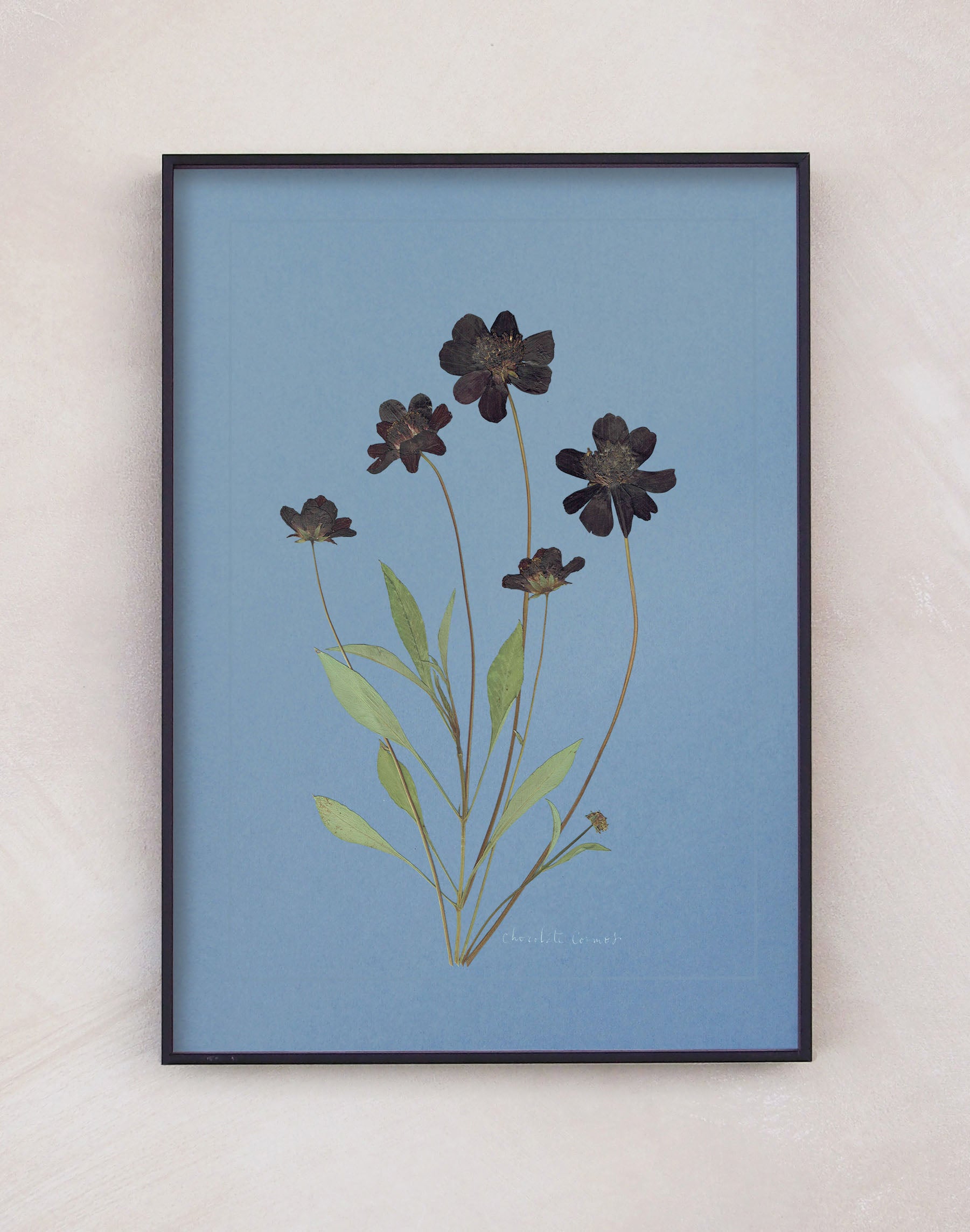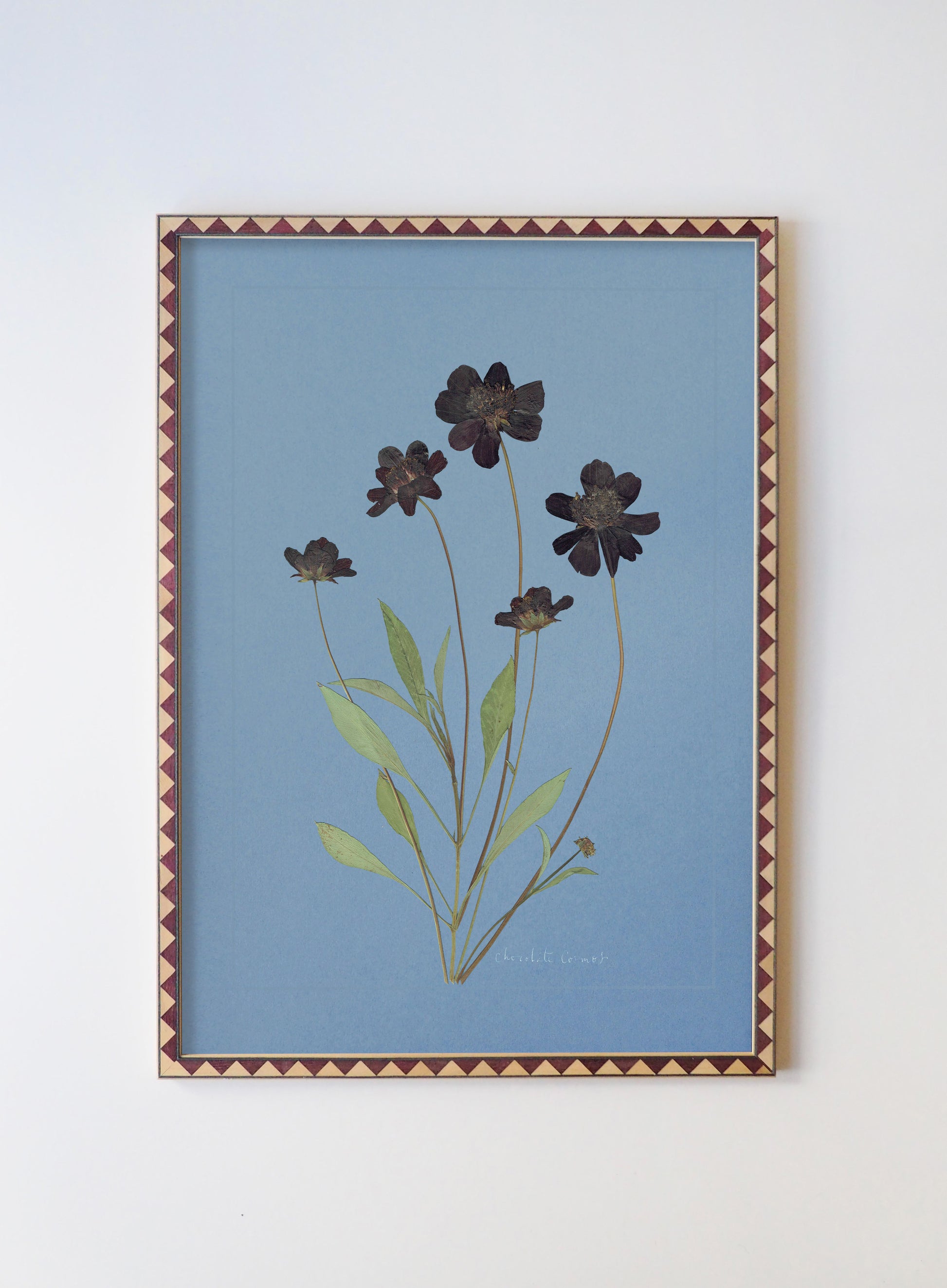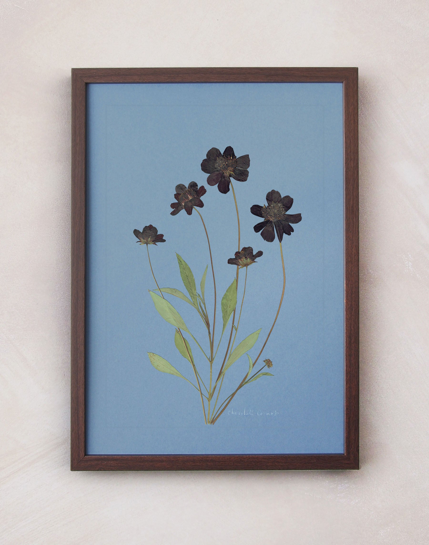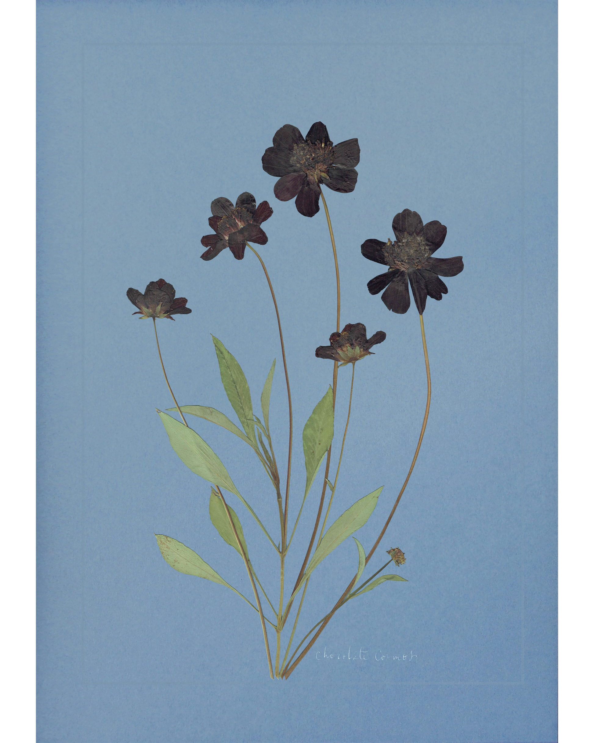 Chocolate Cosmos: pressed at our London studio using traditional methods, mounted on blue 1400 micron board. This specimen is set within a scored border, with its plant name in calligraphy.