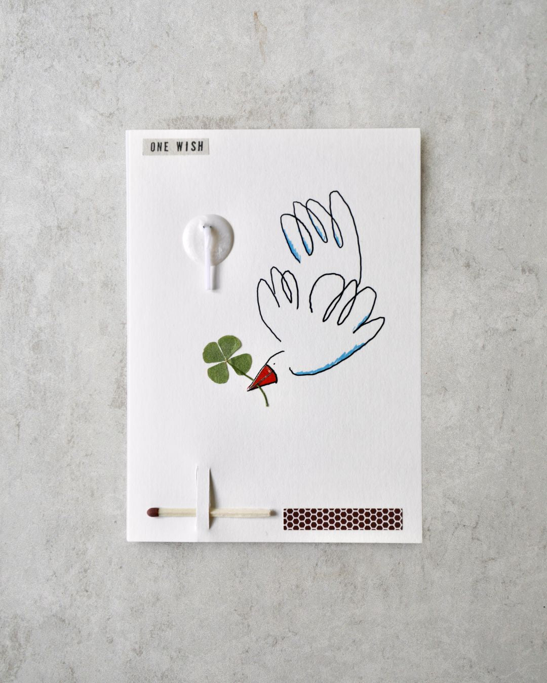 Made in collaboration with Wish Cards, the four leaf clover greetings card is printed with a love bird illustration and mounted with a real pressed clover leaf for luck.