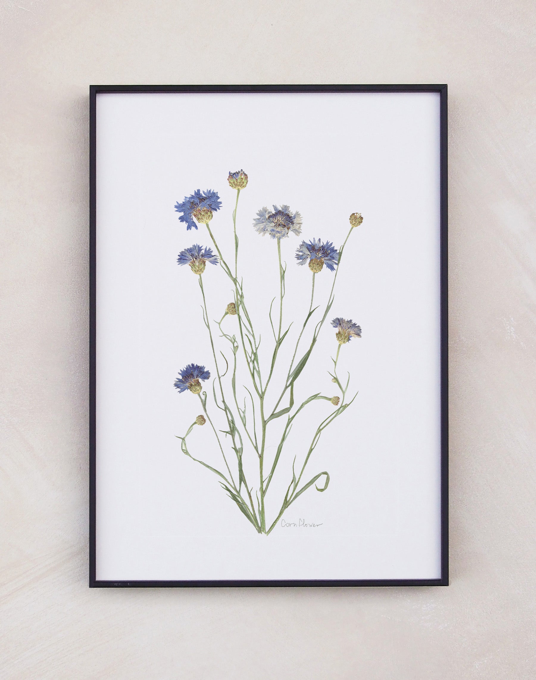 Cornflower: pressed at our London studio using traditional methods, mounted on off-white 1400 micron board. This specimen is set within a scored border, with its plant name in calligraphy.