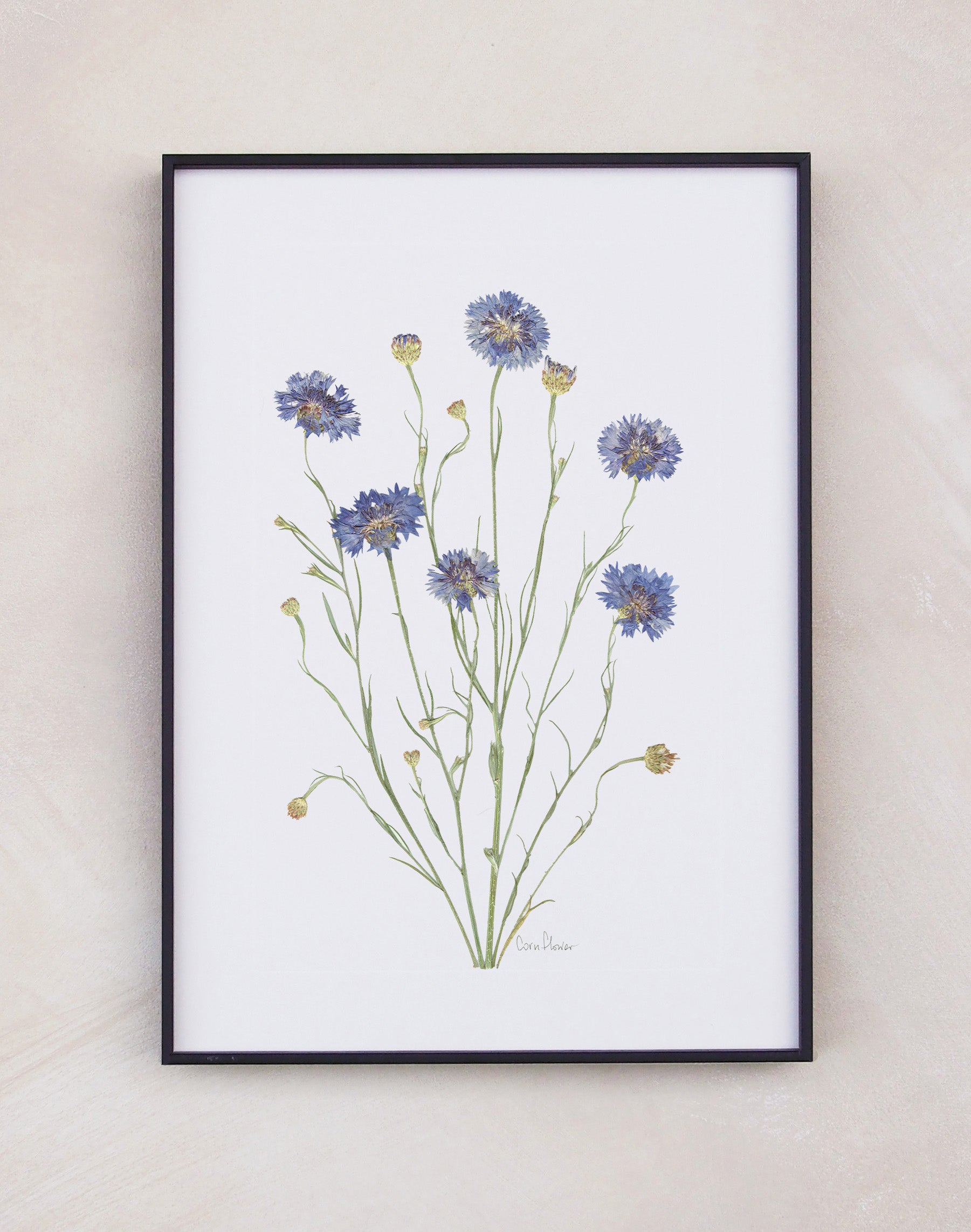 Cornflower: pressed at our London studio using traditional methods, mounted on off-white 1400 micron board. This specimen is set within a scored border, with its plant name in calligraphy.