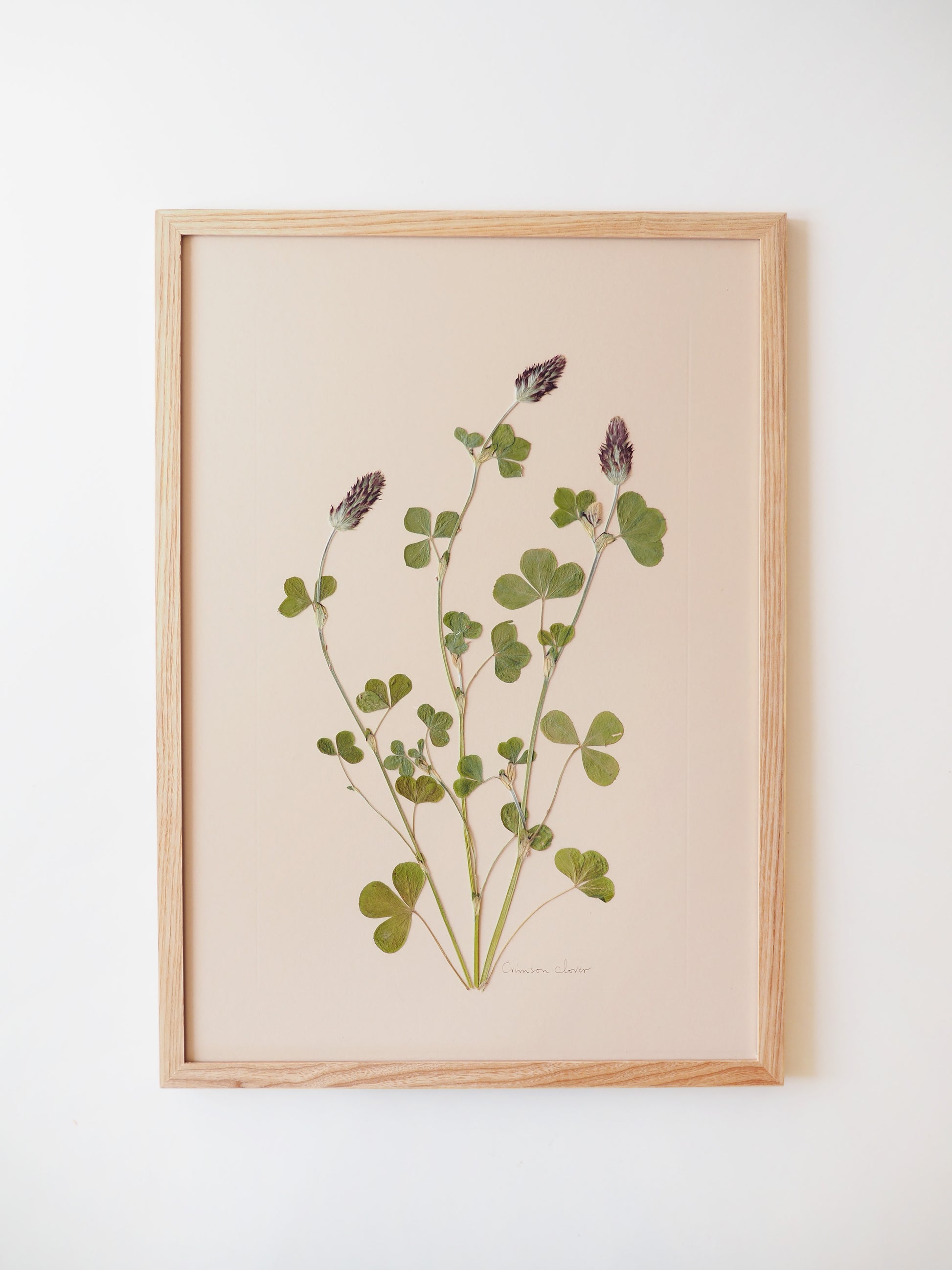 Crimson Clover: pressed at our London studio using traditional methods, mounted on parchment 1400 micron board. This specimen is set within a scored border, with its plant name in calligraphy.