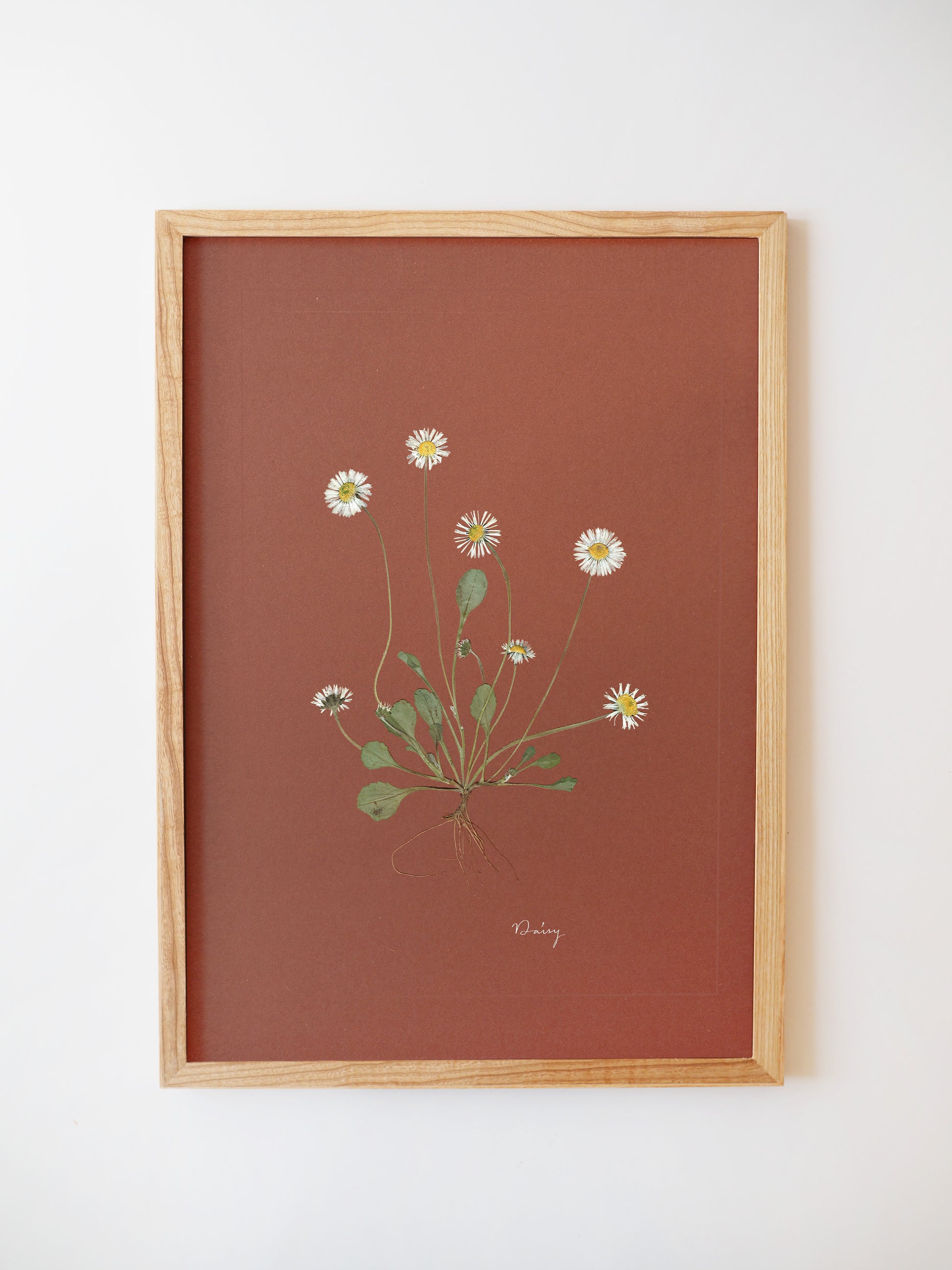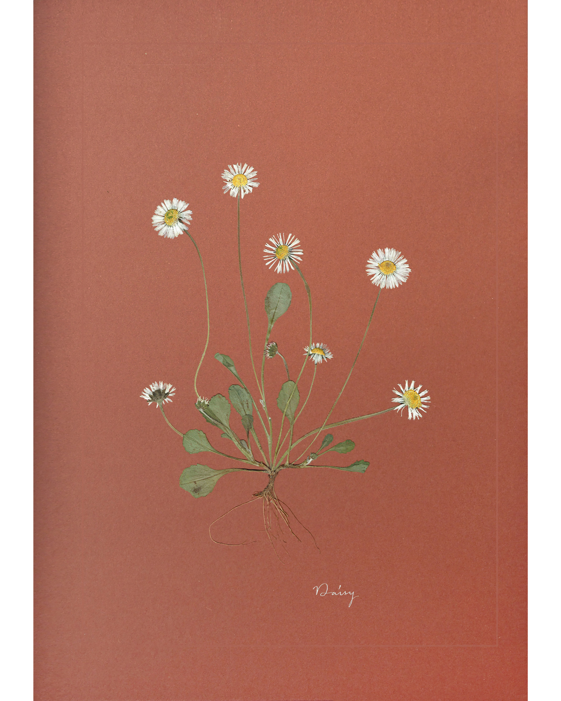 Daisy: pressed at our London studio using traditional methods, mounted on rust 1400 micron board. This specimen is set within a scored border, with its plant name in calligraphy.