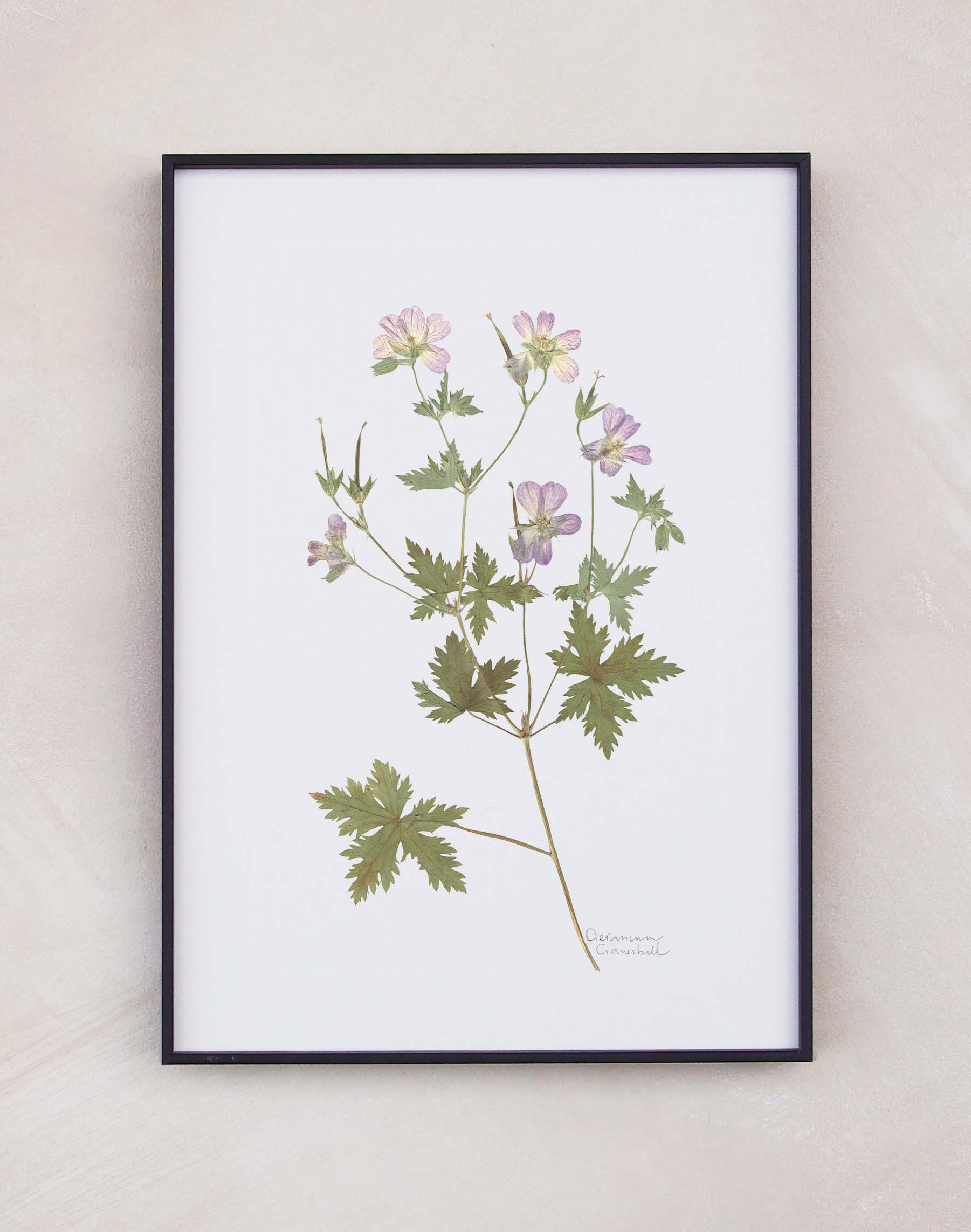 Geranium Cranesbill: pressed at our London studio using traditional methods, mounted on off-white 1400 micron board. This specimen is set within a scored border, with its plant name in calligraphy.