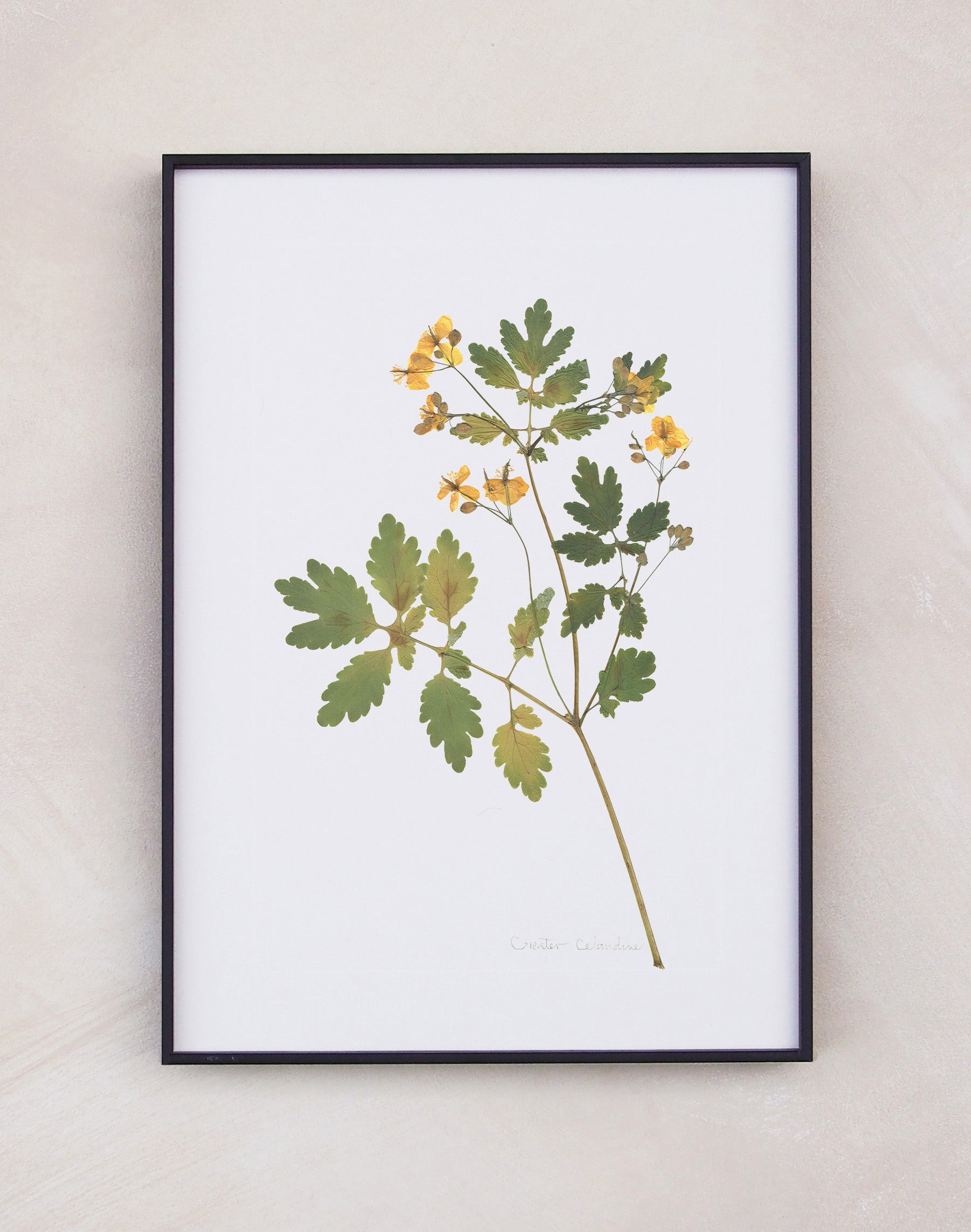 Greater Celandine: pressed at our London studio using traditional methods, mounted on off-white 1400 micron board. This specimen is set within a scored border, with its plant name in calligraphy.