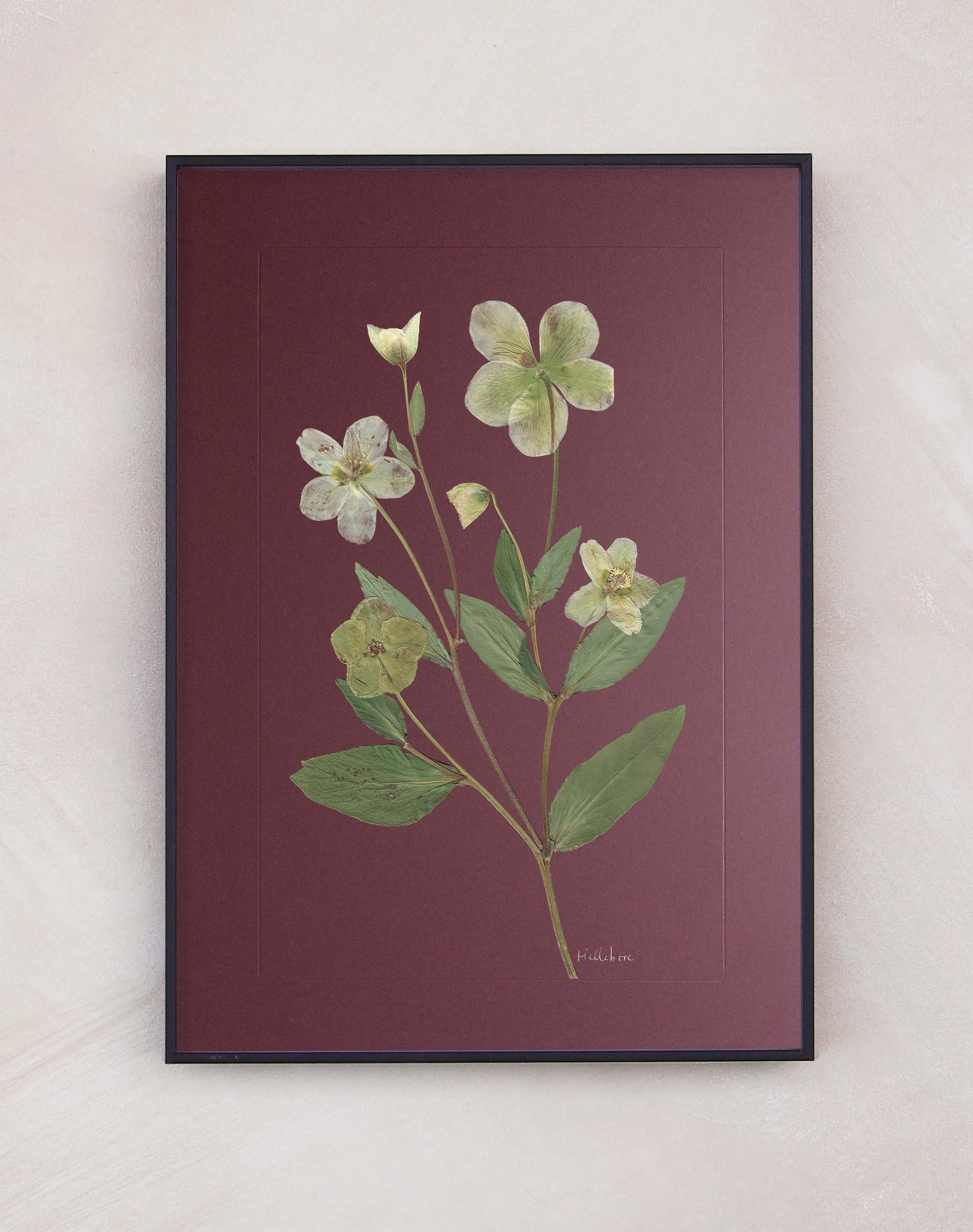 Hellebore: pressed at our London studio using traditional methods, mounted on maroon 1400 micron board. This specimen is set within a scored border, with its plant name in calligraphy.