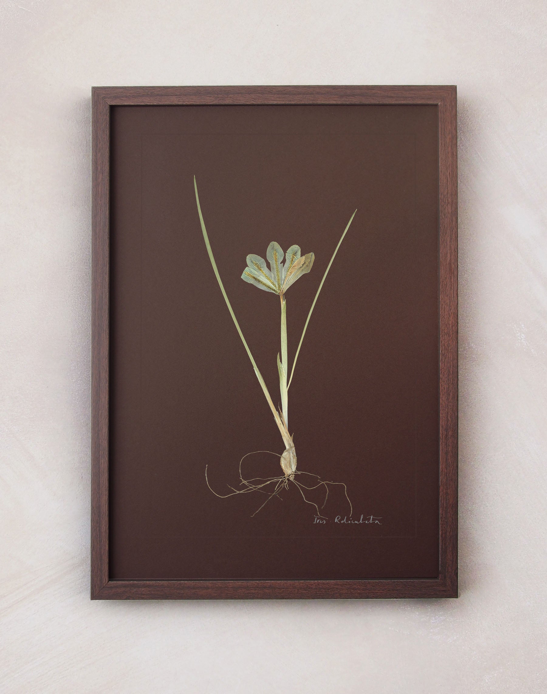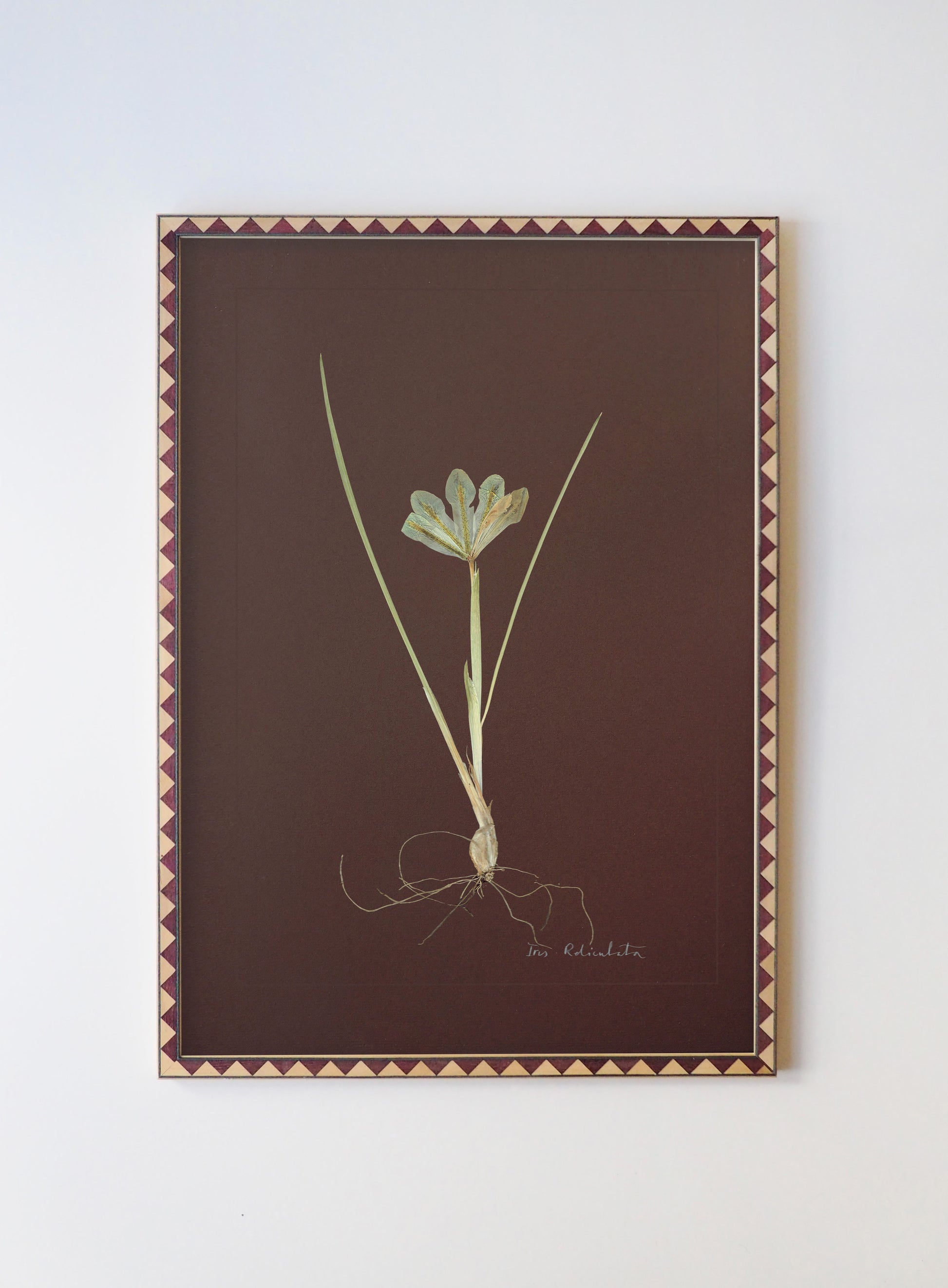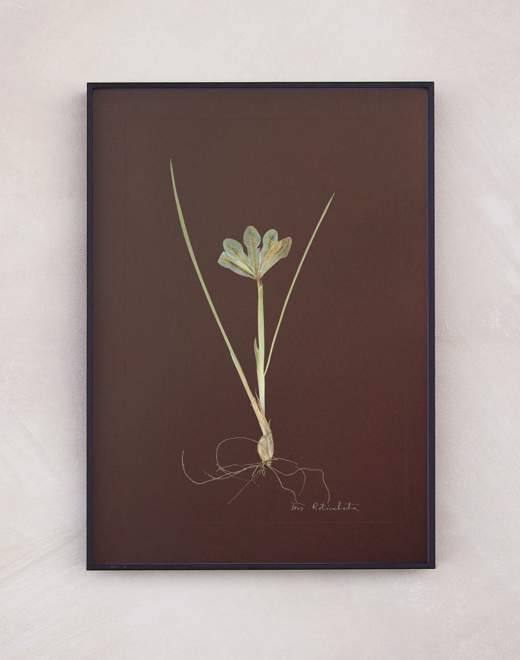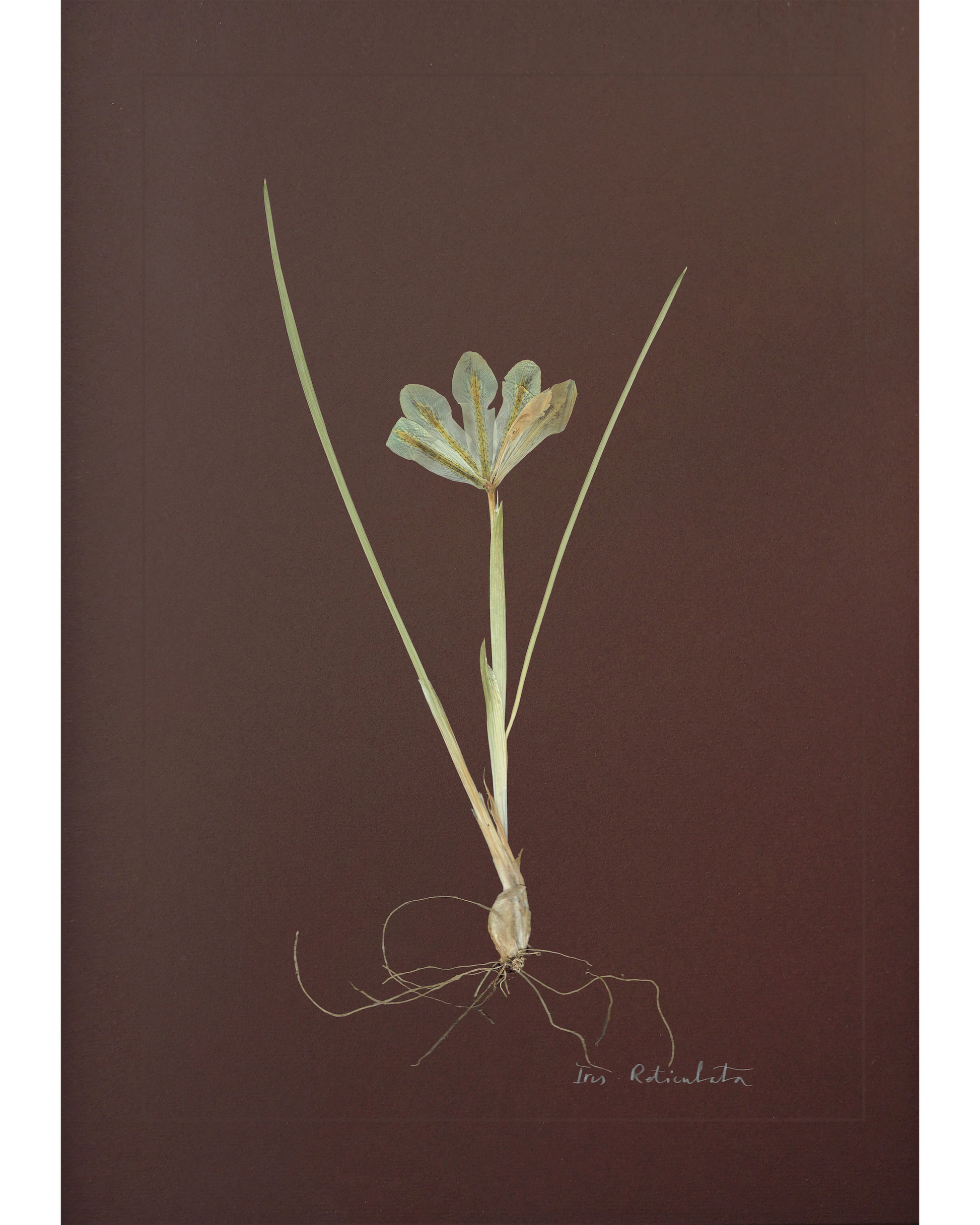 Iris Reticulata: pressed at our London studio using traditional methods, mounted on chocolate 1400 micron board. This specimen is set within a scored border, with its plant name in calligraphy.