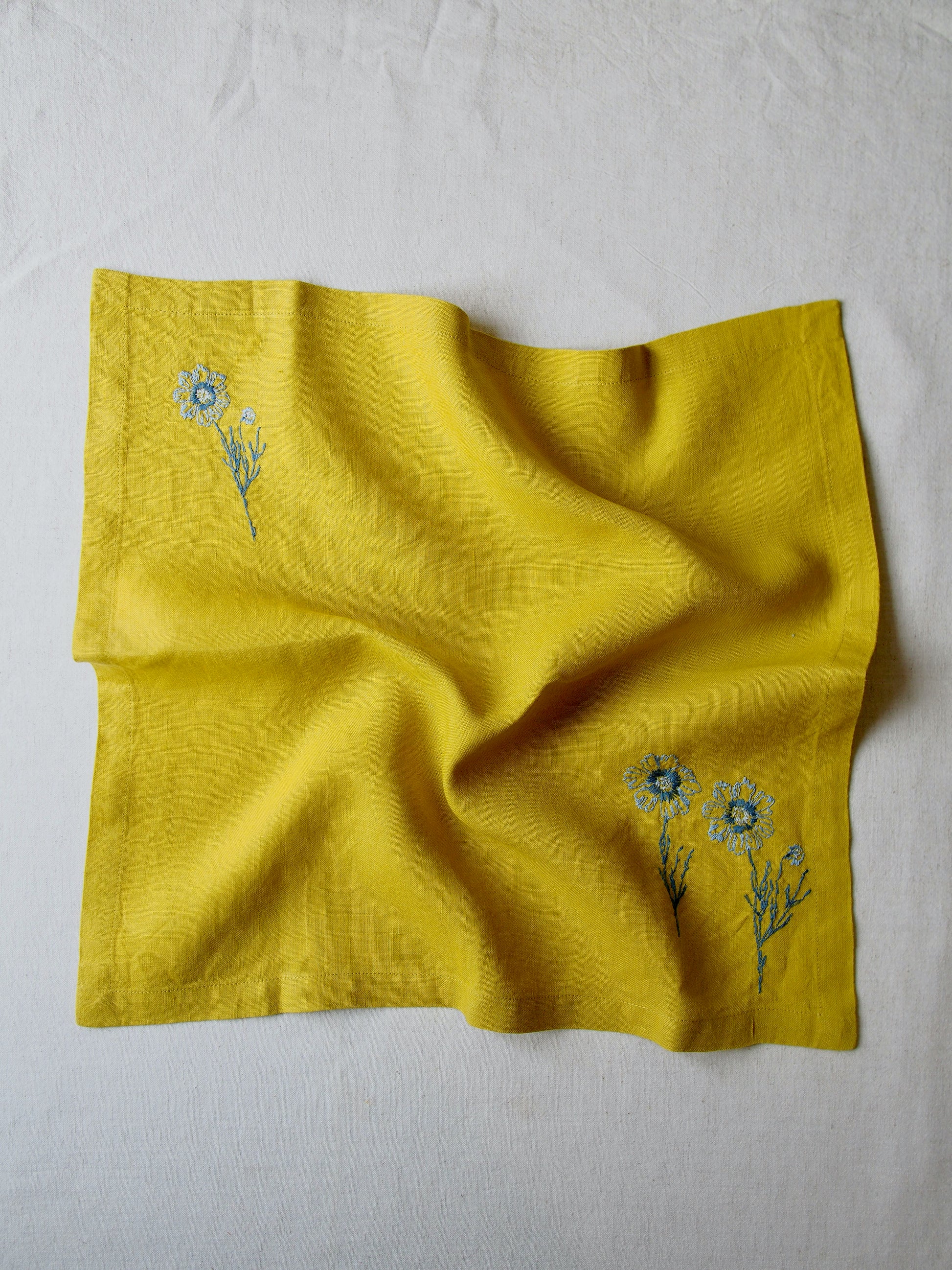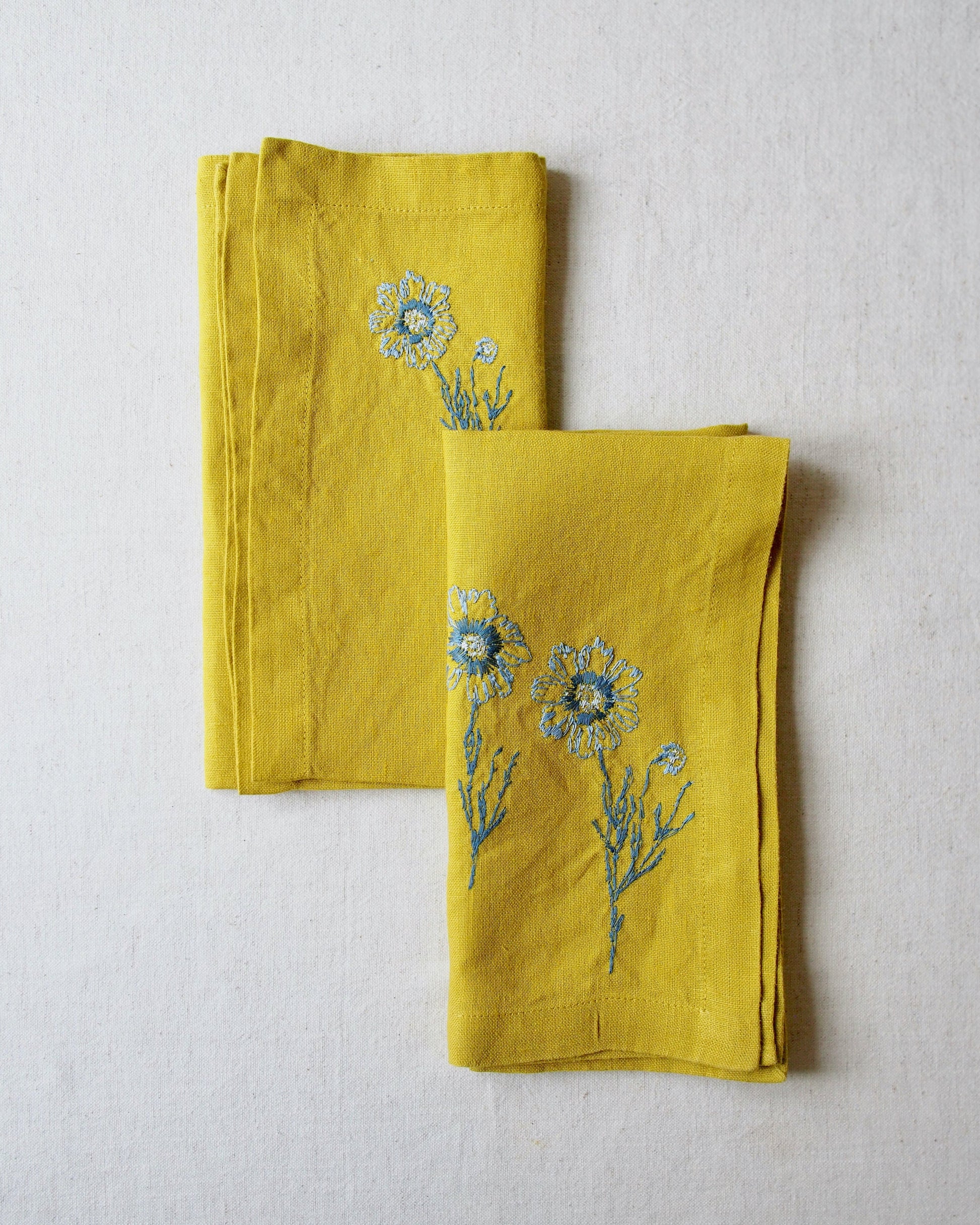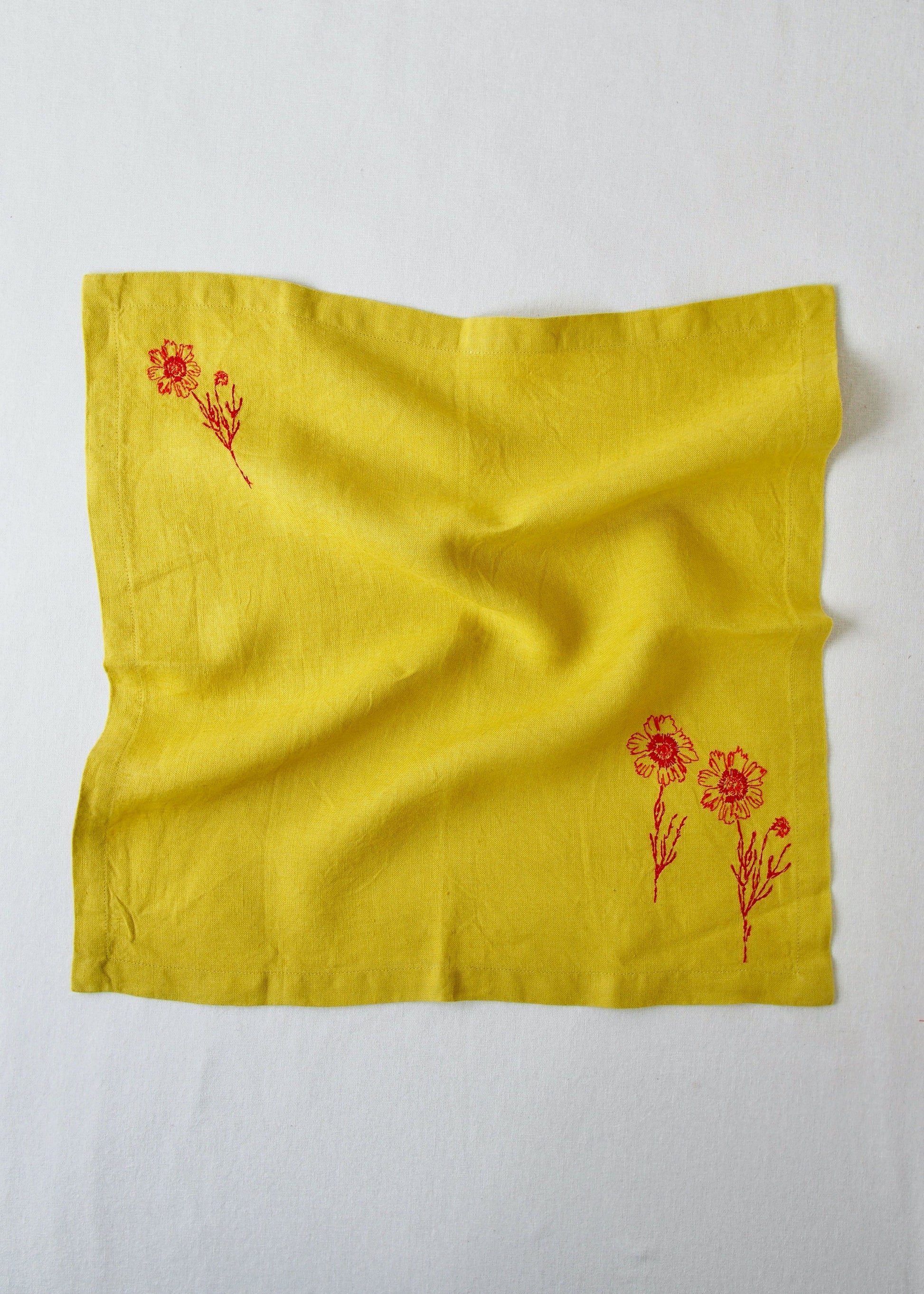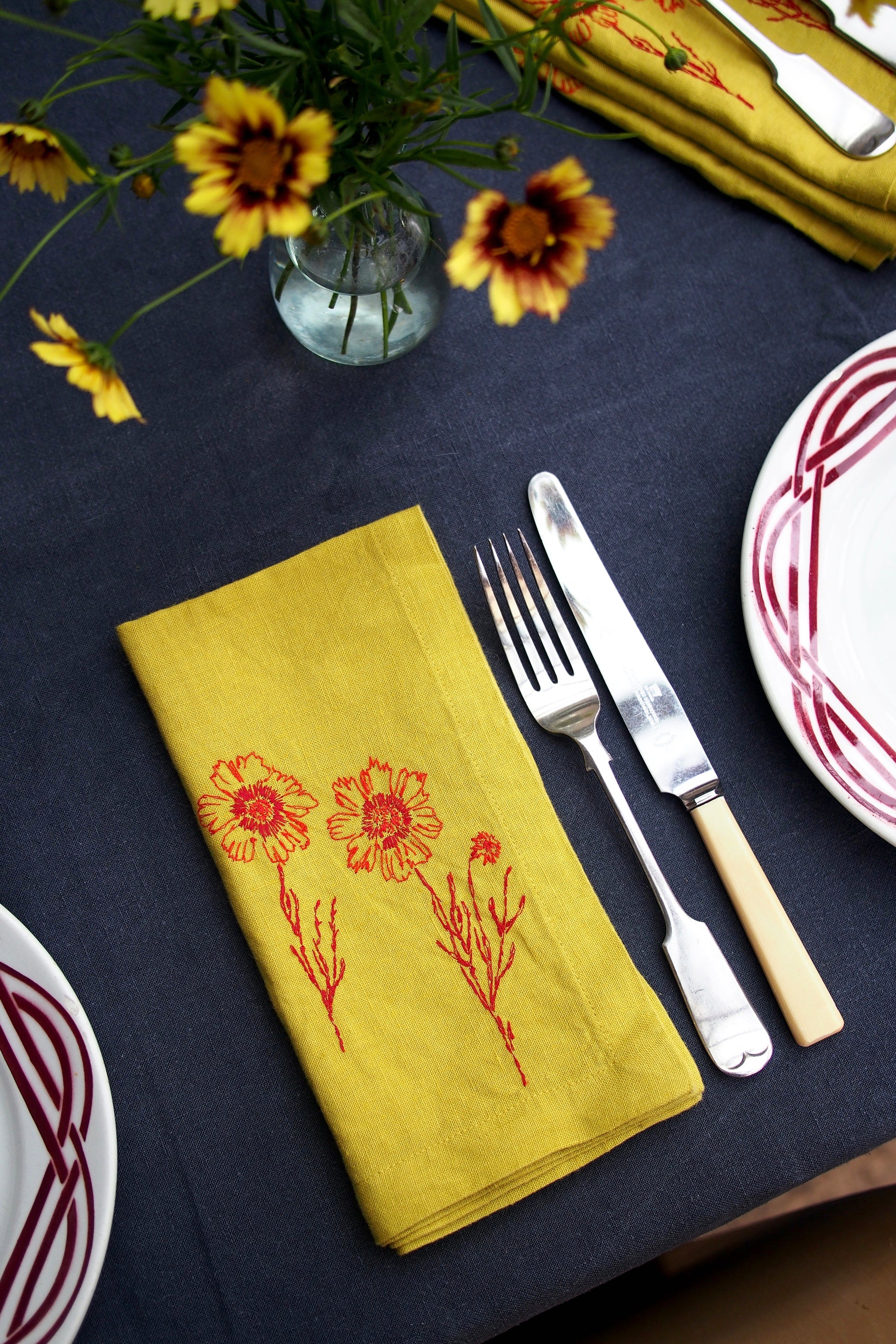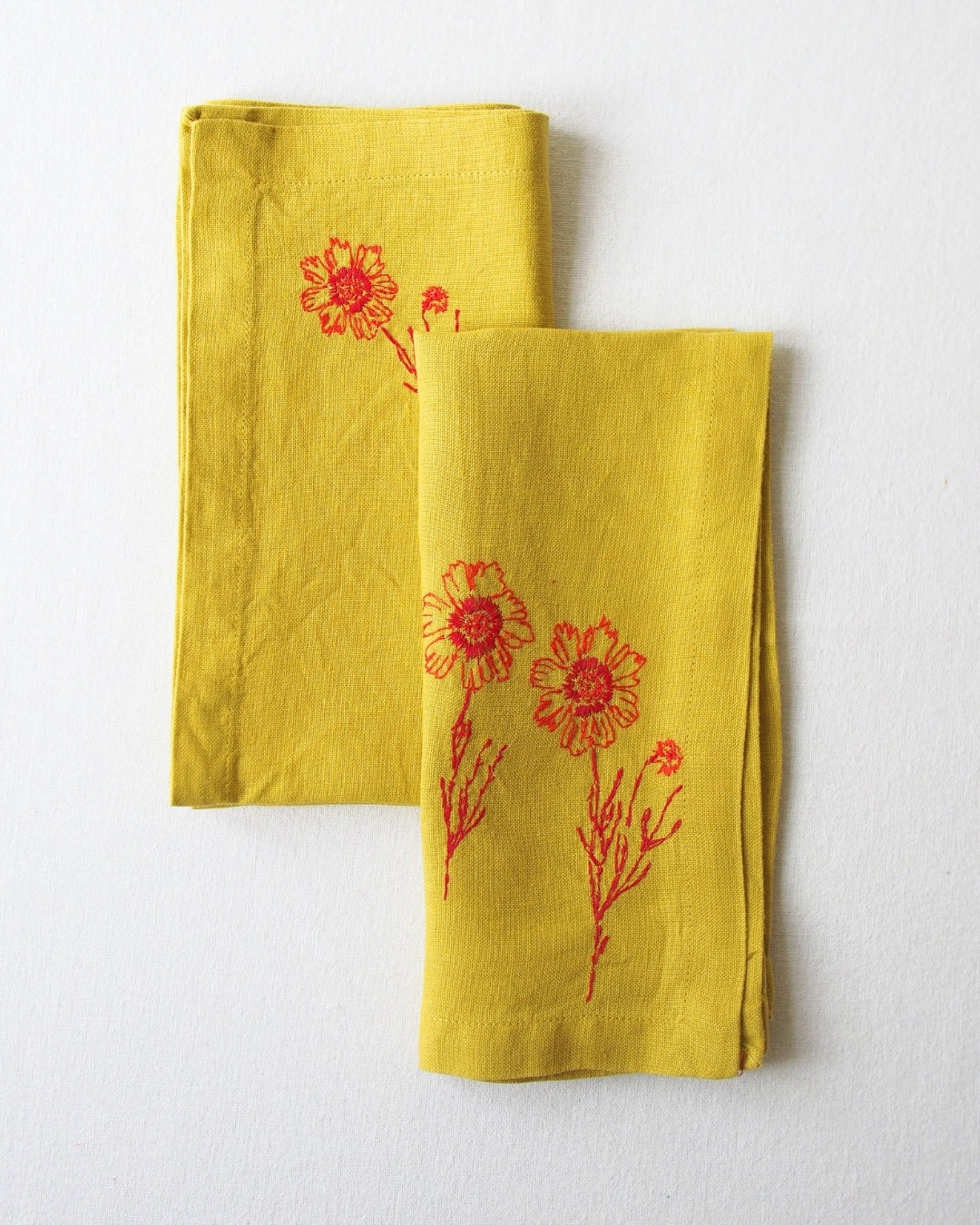 A functional, long lasting, and colourful addition to your table, these napkins simply get better with age. Our mustard yellow linen napkins feature sketchy embroidered coreopsis motifs stitched in tones of red. The playful placement of embroidery allows for any fold or positioning to look chic.