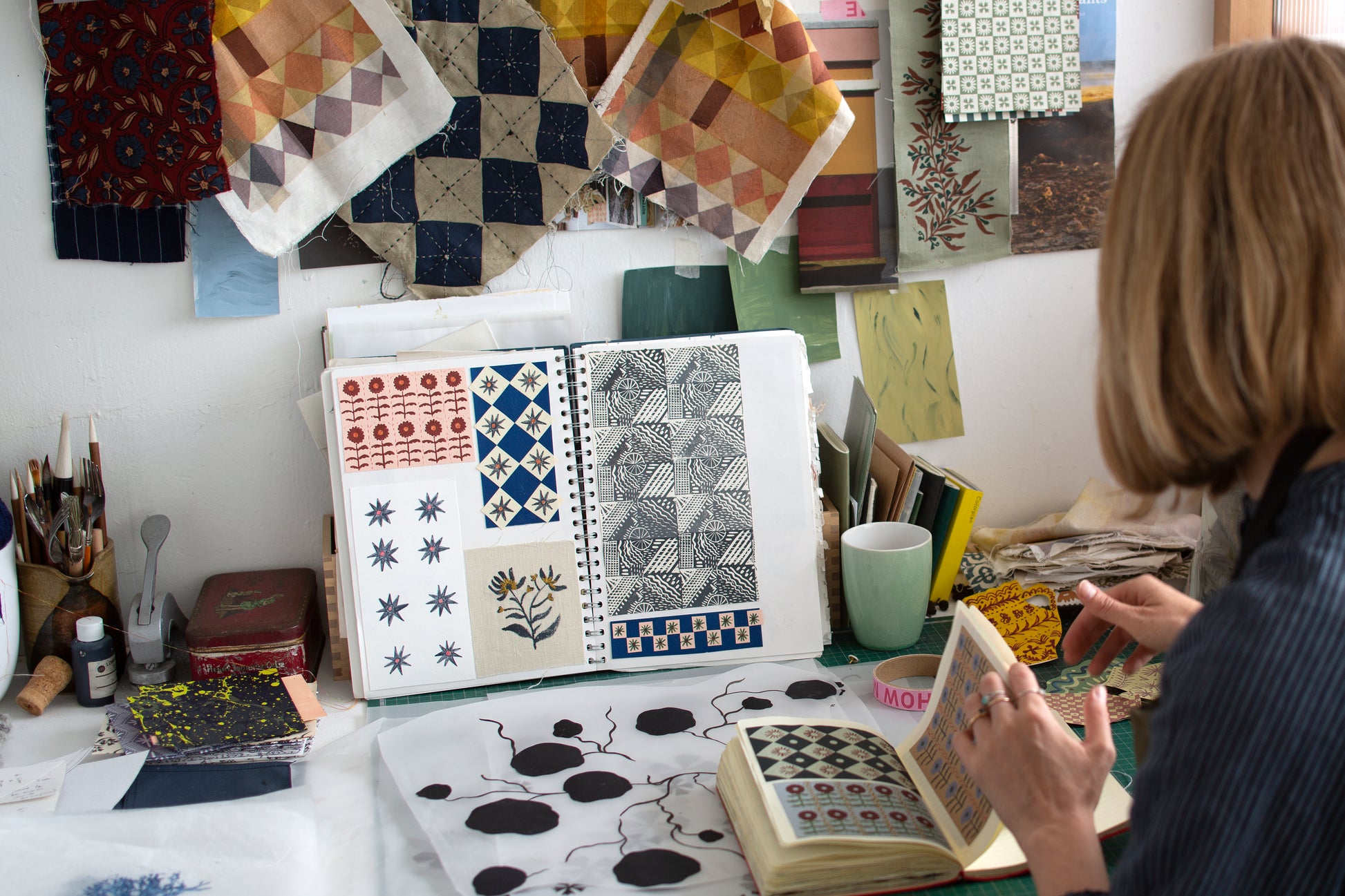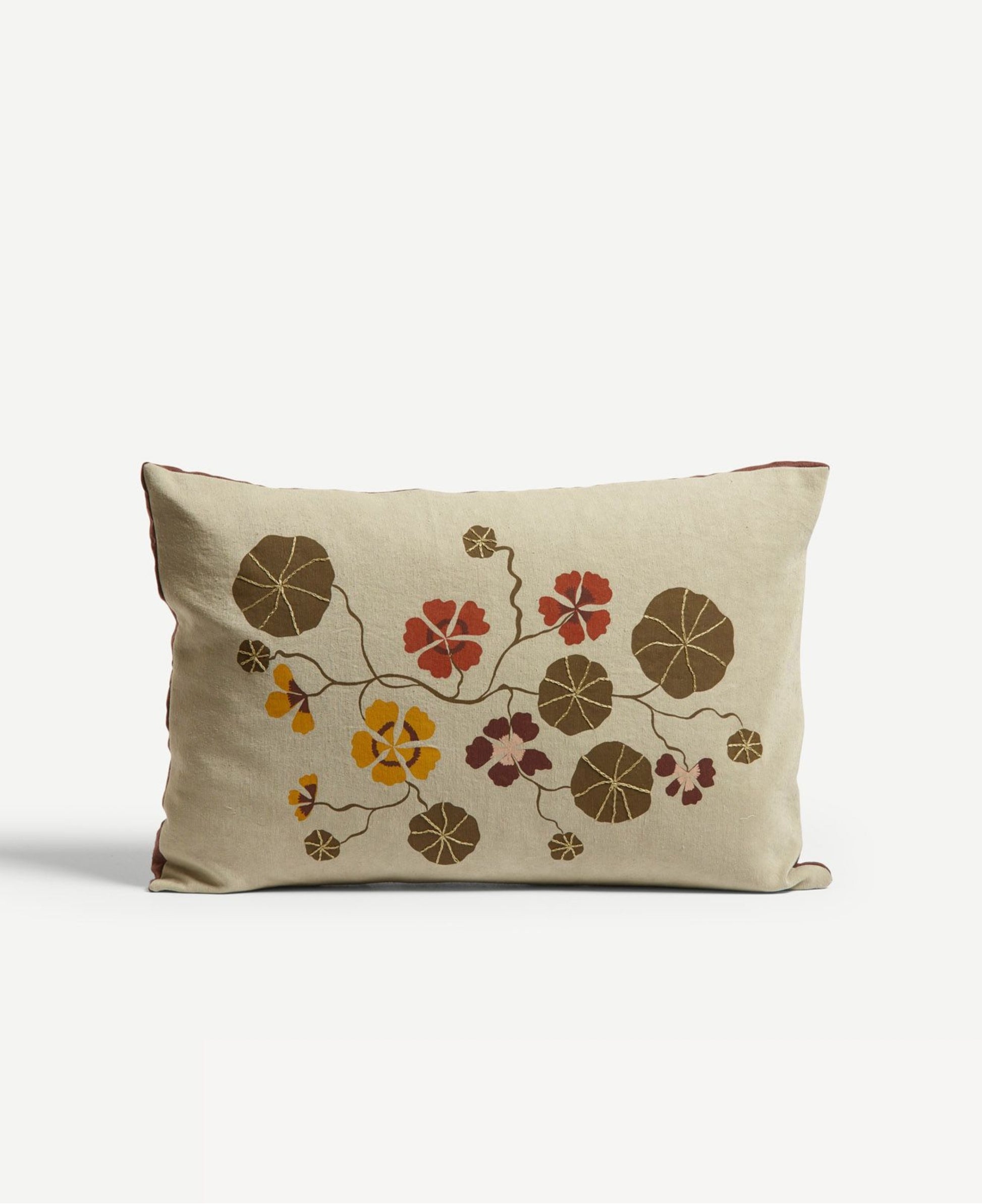 Each of Rosemary's cushion covers are made to order by silk screen printing multiple layers onto a hemp silk fabric. They are then hand embroidered using chain stitch, stab stitch and french knots.