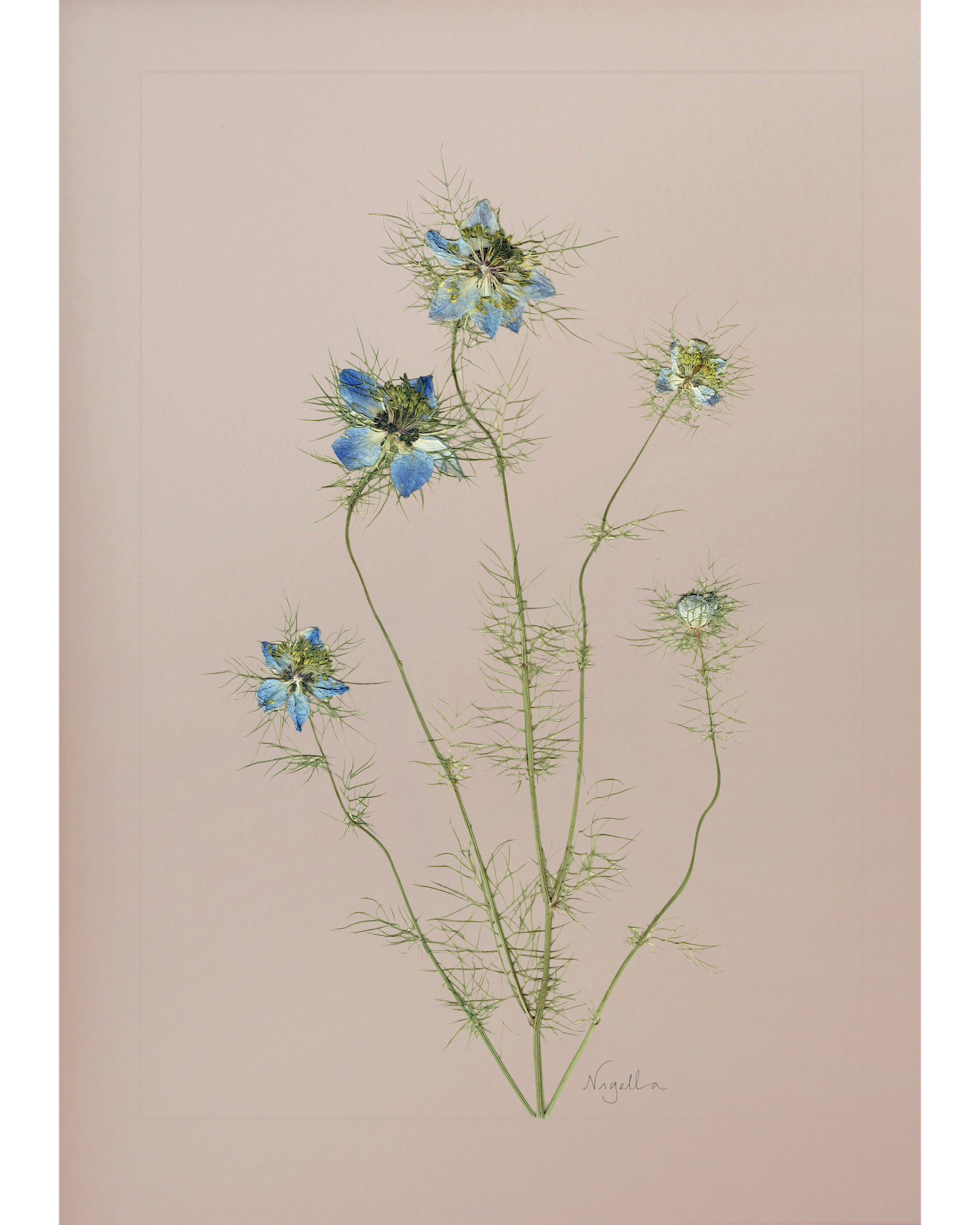 Nigella: pressed at our London studio using traditional methods, mounted on parchment 1400 micron board. This specimen is set within a scored border, with its plant name in calligraphy.