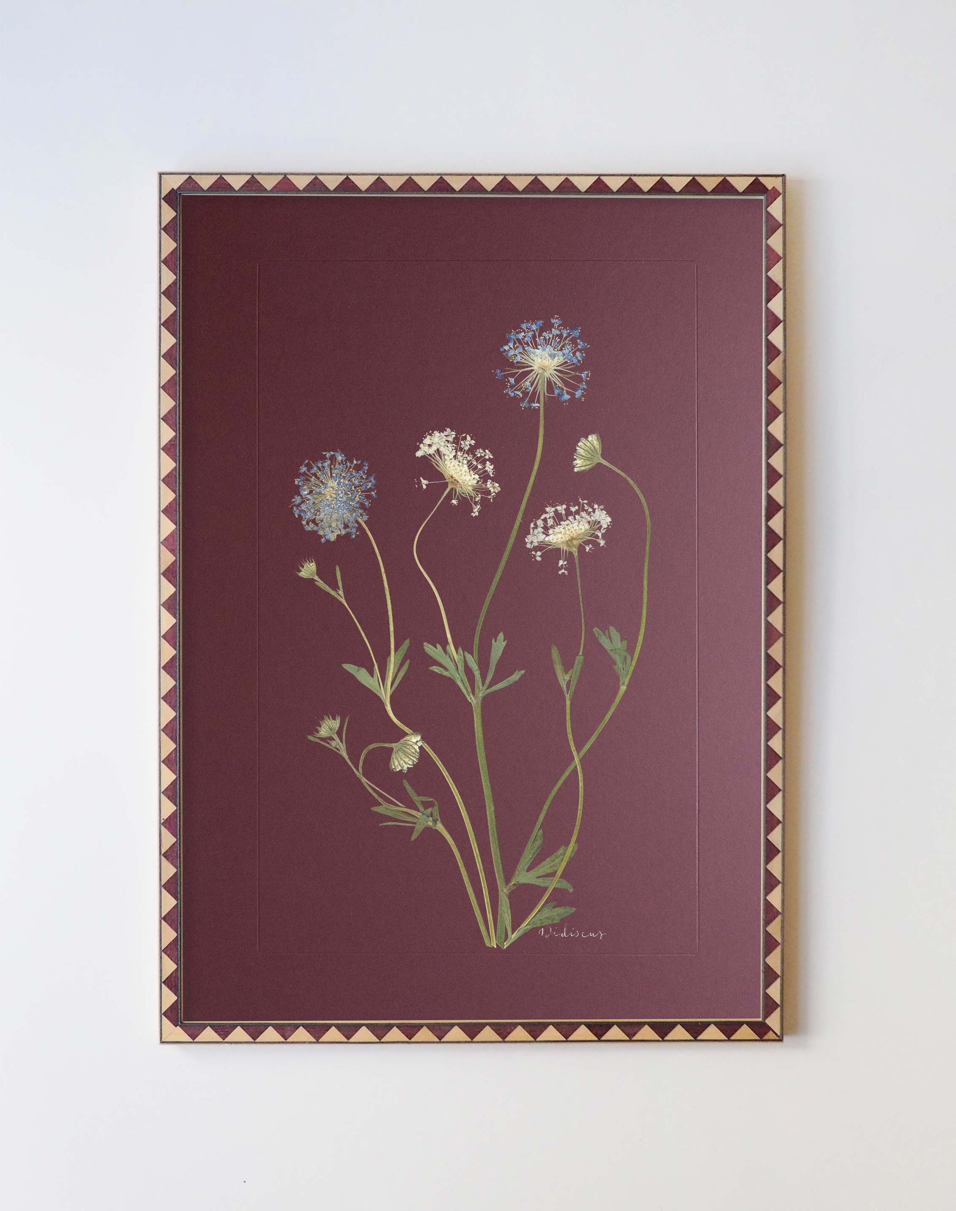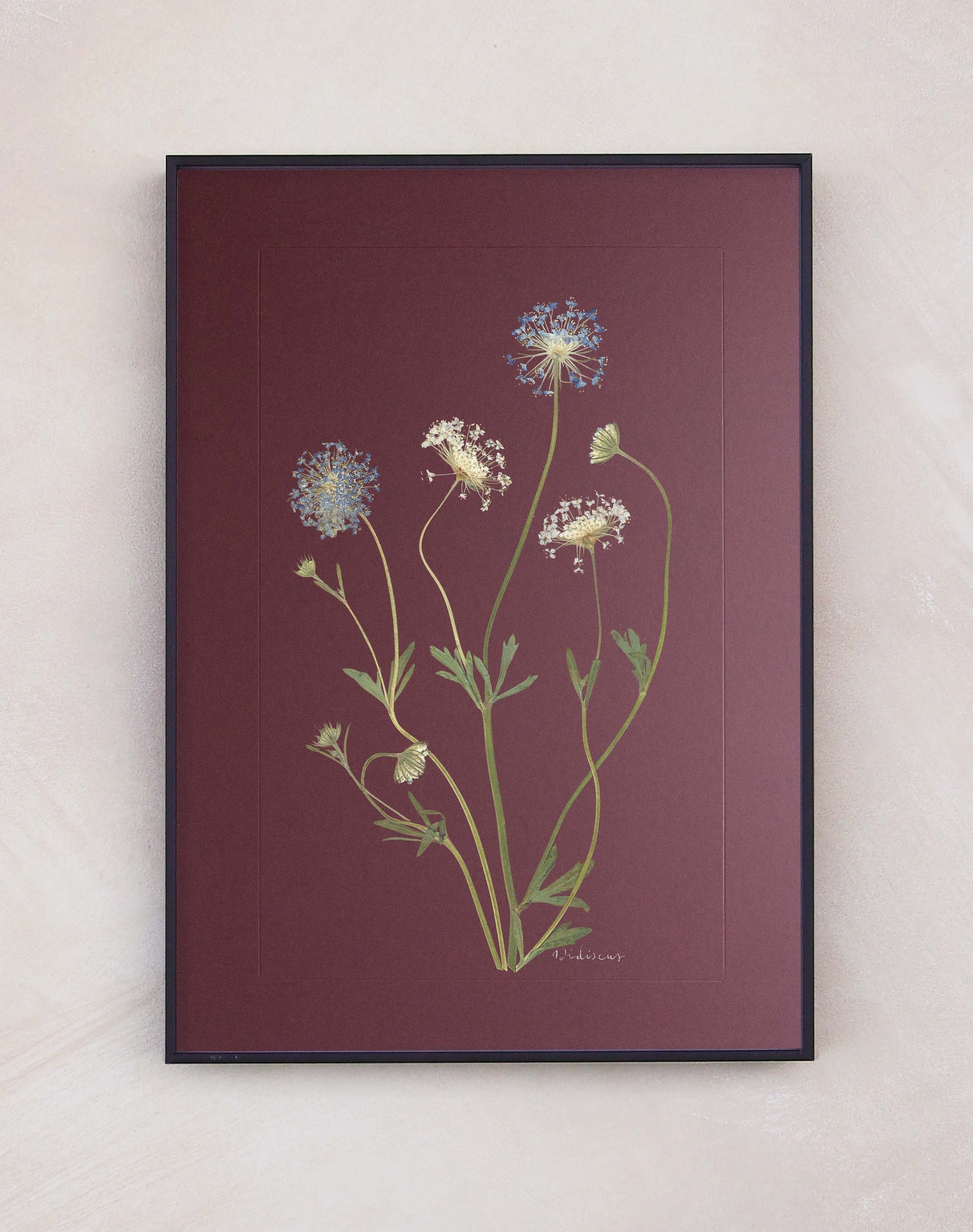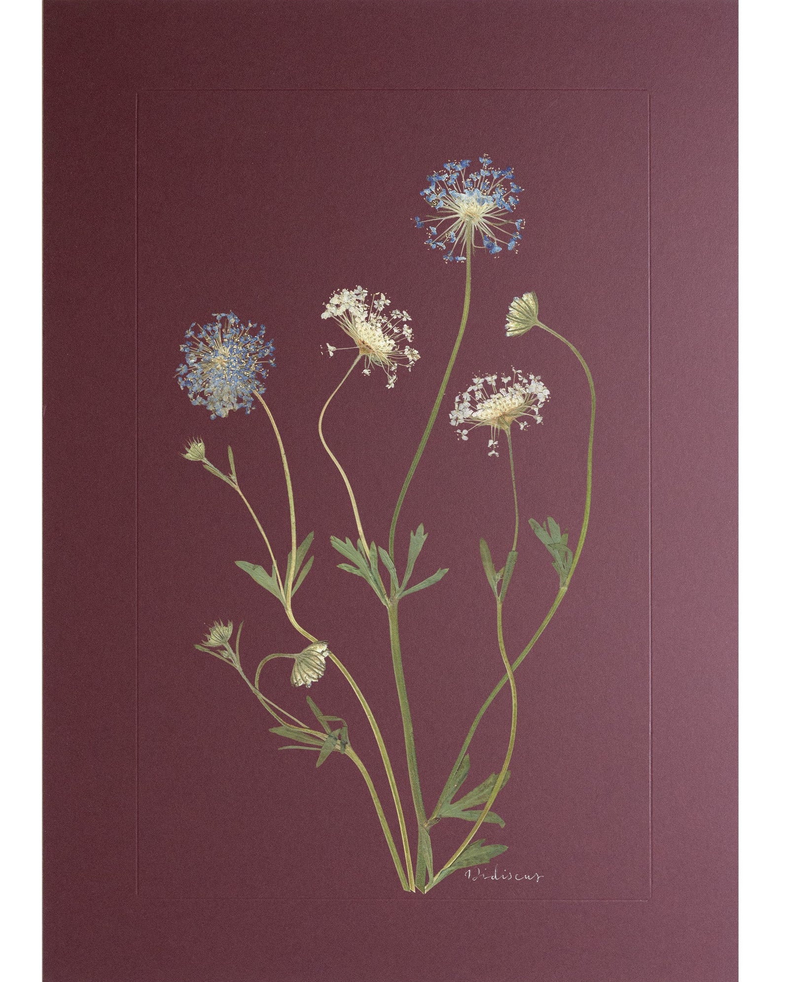 Didiscus: pressed at our London studio using traditional methods, mounted on chocolate brown 1400 micron board. This specimen is set within a scored border, with its plant name in calligraphy.