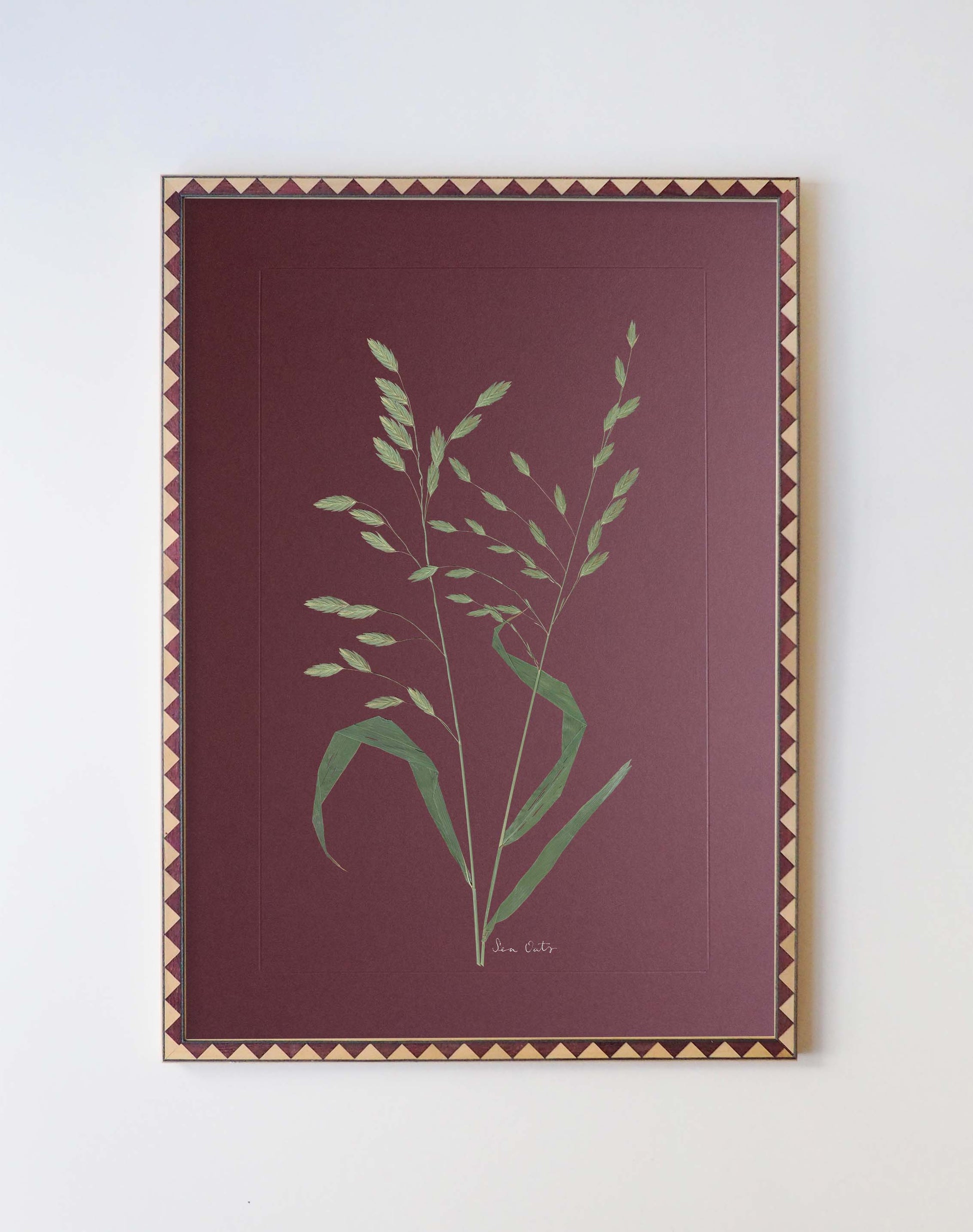 Sea Oats: pressed at our London studio using traditional methods, mounted on chocolate brown 1400 micron board. This specimen is set within a scored border, with its plant name in calligraphy.