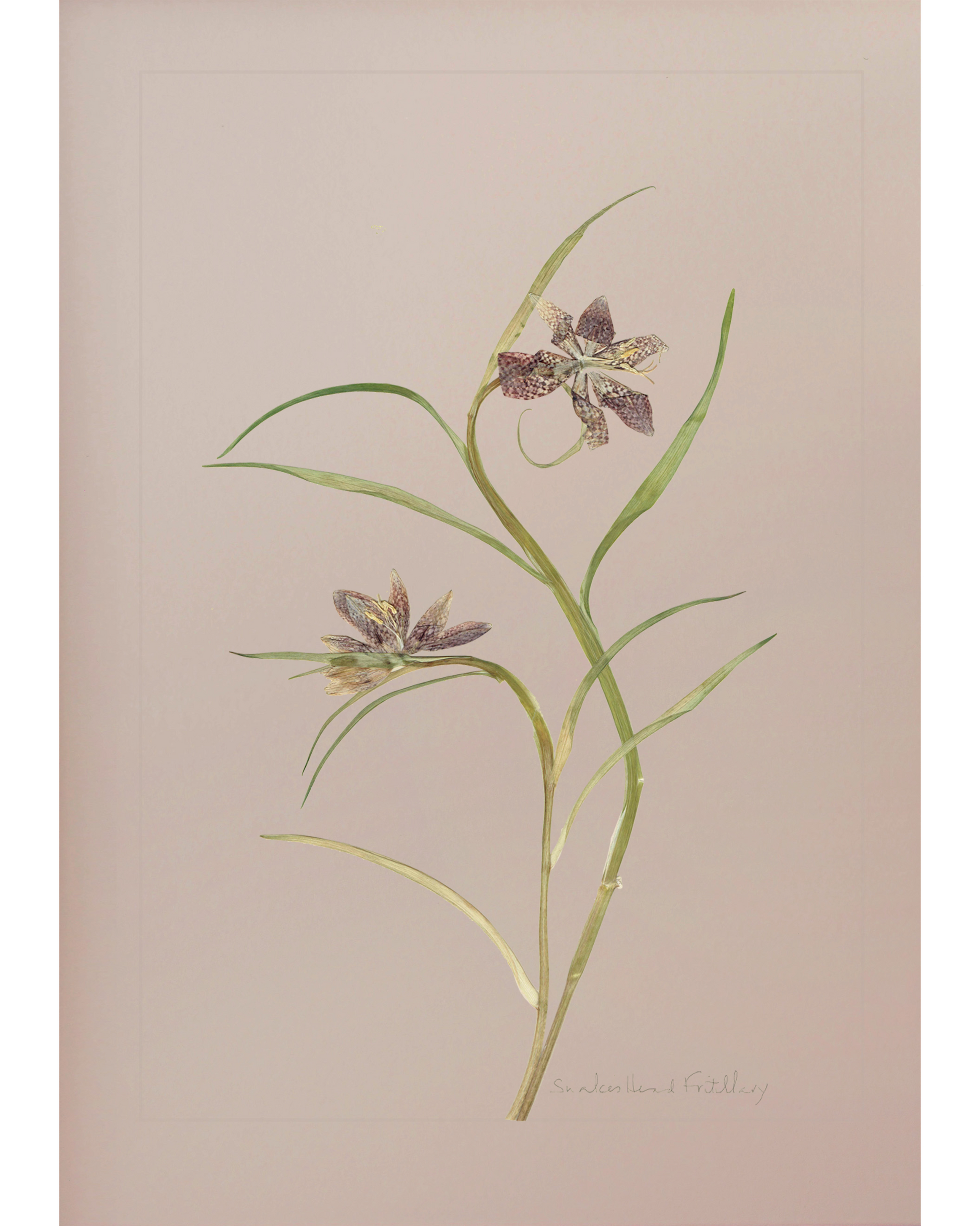 Snake's Head Fritillary: pressed at our London studio using traditional methods, mounted on parchment 1400 micron board. This specimen is set within a scored border, with its plant name in calligraphy.