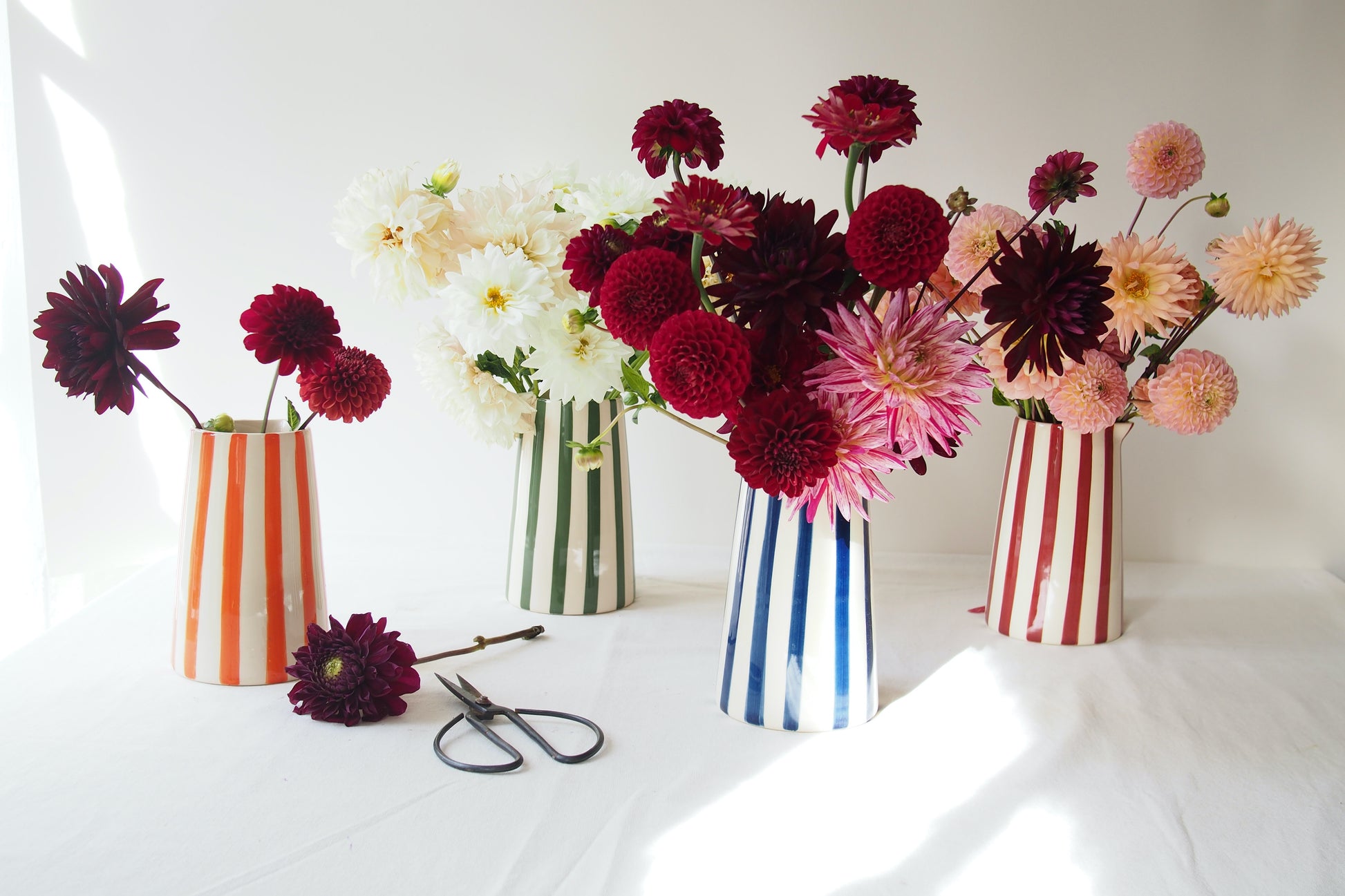 The candy striped jug in tangerine, designed by Musango, a family run business based in Herefordshire. Practical and stylish, this versatile vessel can be used as a flower vase, water pitcher or a decorative utensil holder. Hand made and hand painted by artisans in Portugal.