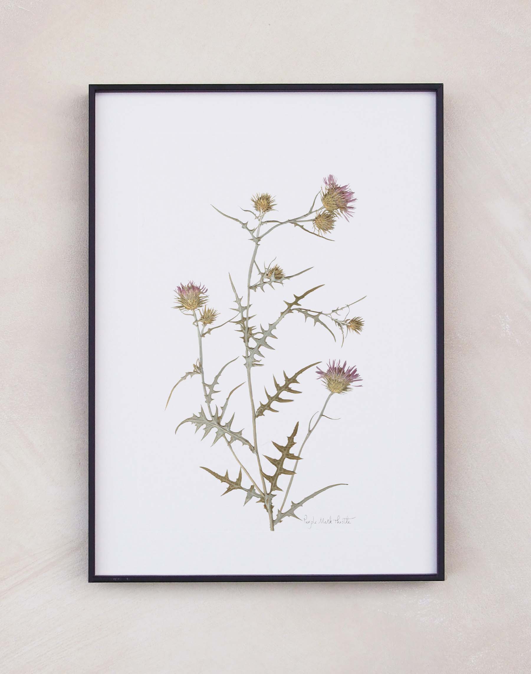 Purple Milk Thistle: pressed at our London studio using traditional methods, mounted on off-white 1400 micron board. This specimen is set within a scored border, with its plant name in calligraphy.