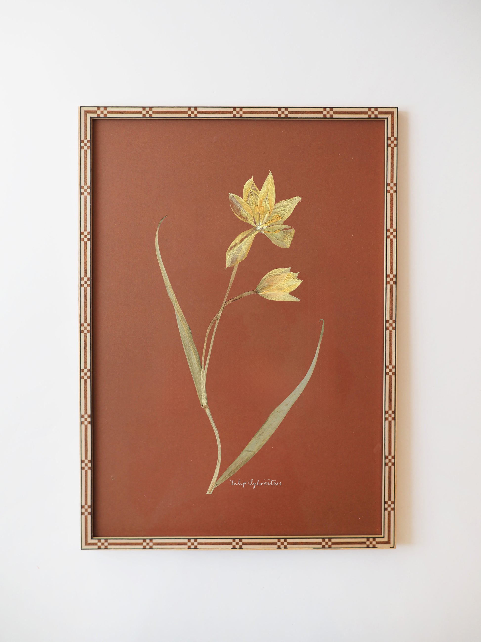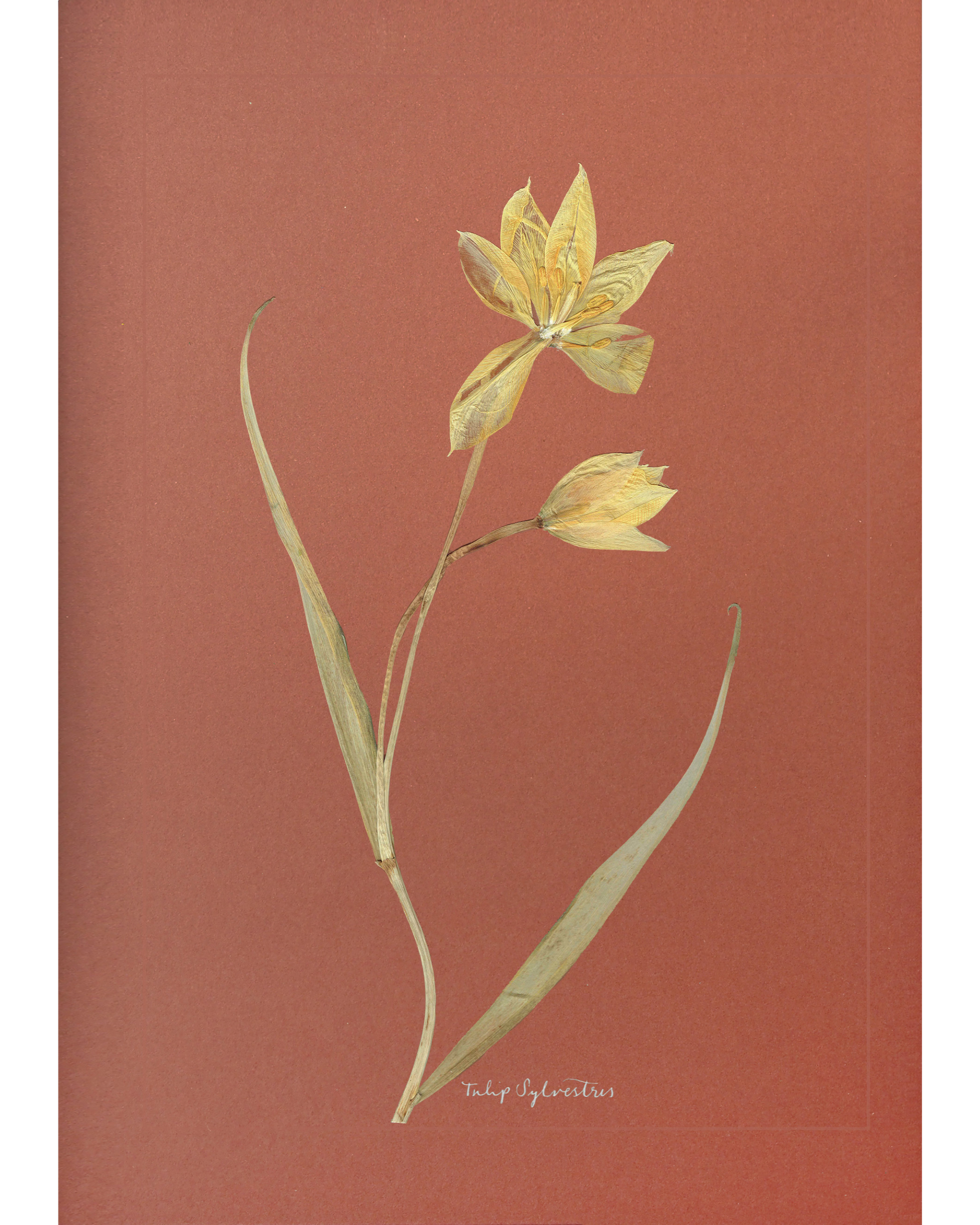 Tulip Sylvestris: pressed at our London studio using traditional methods, mounted on rust 1400 micron board. This specimen is set within a scored border, with its plant name in calligraphy.
