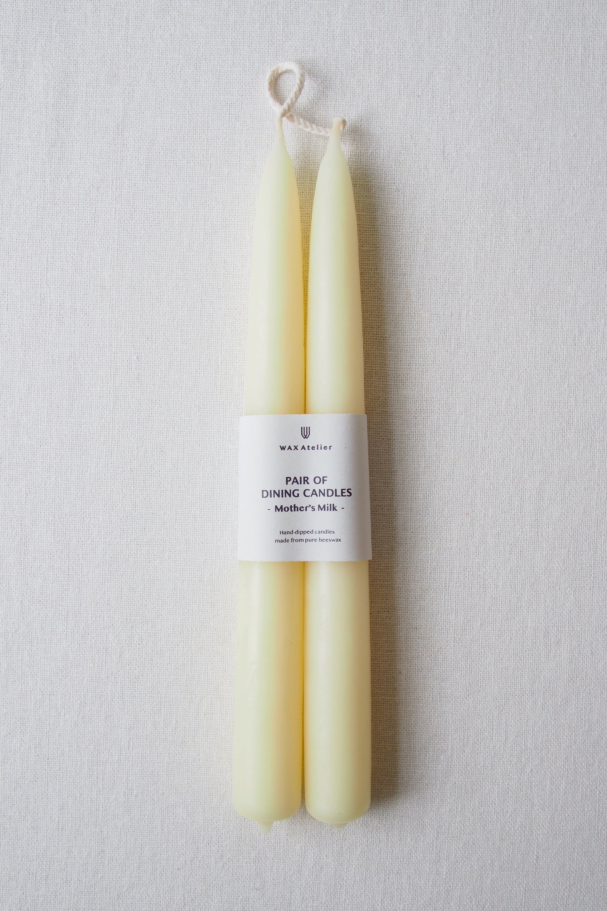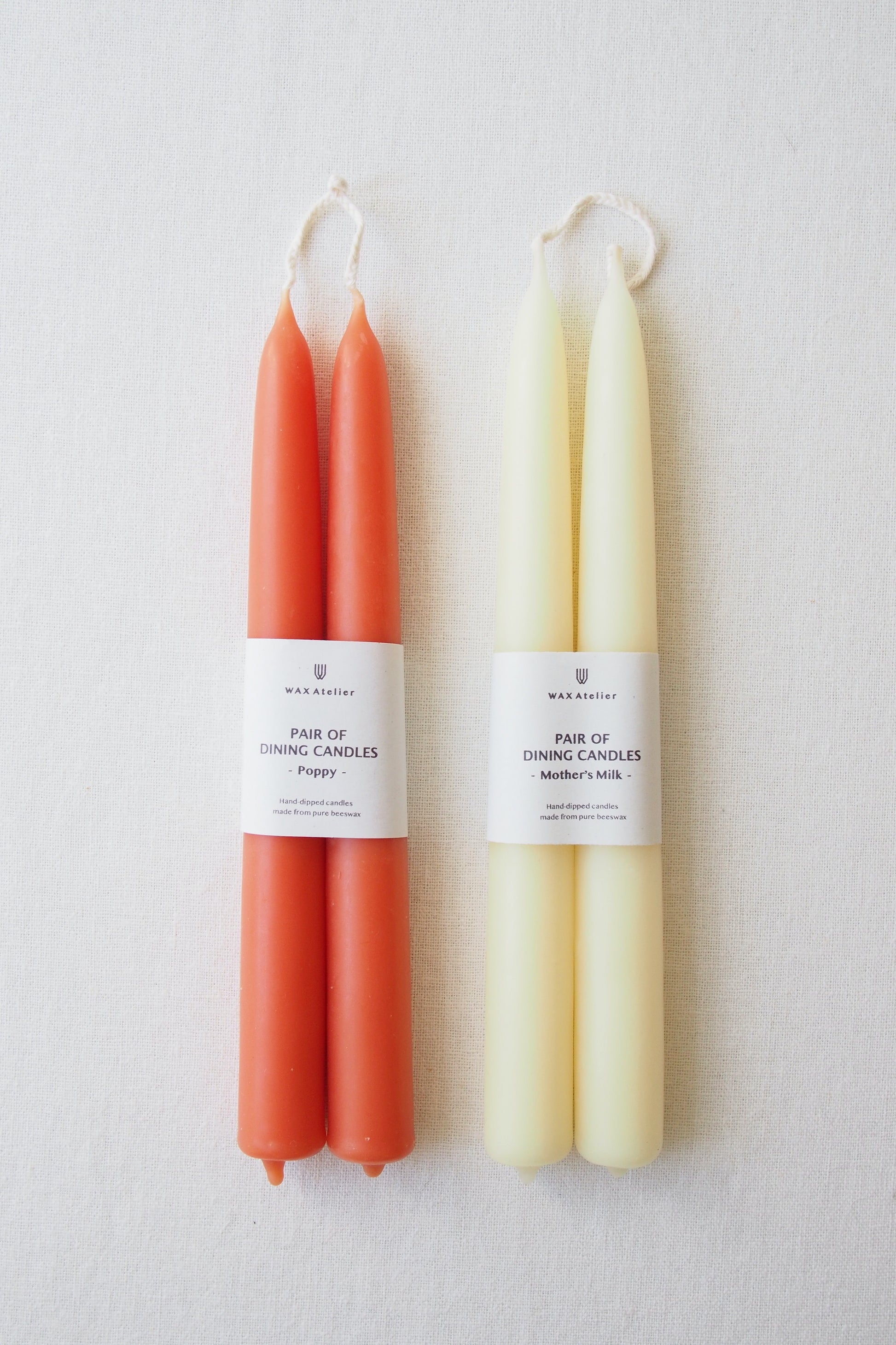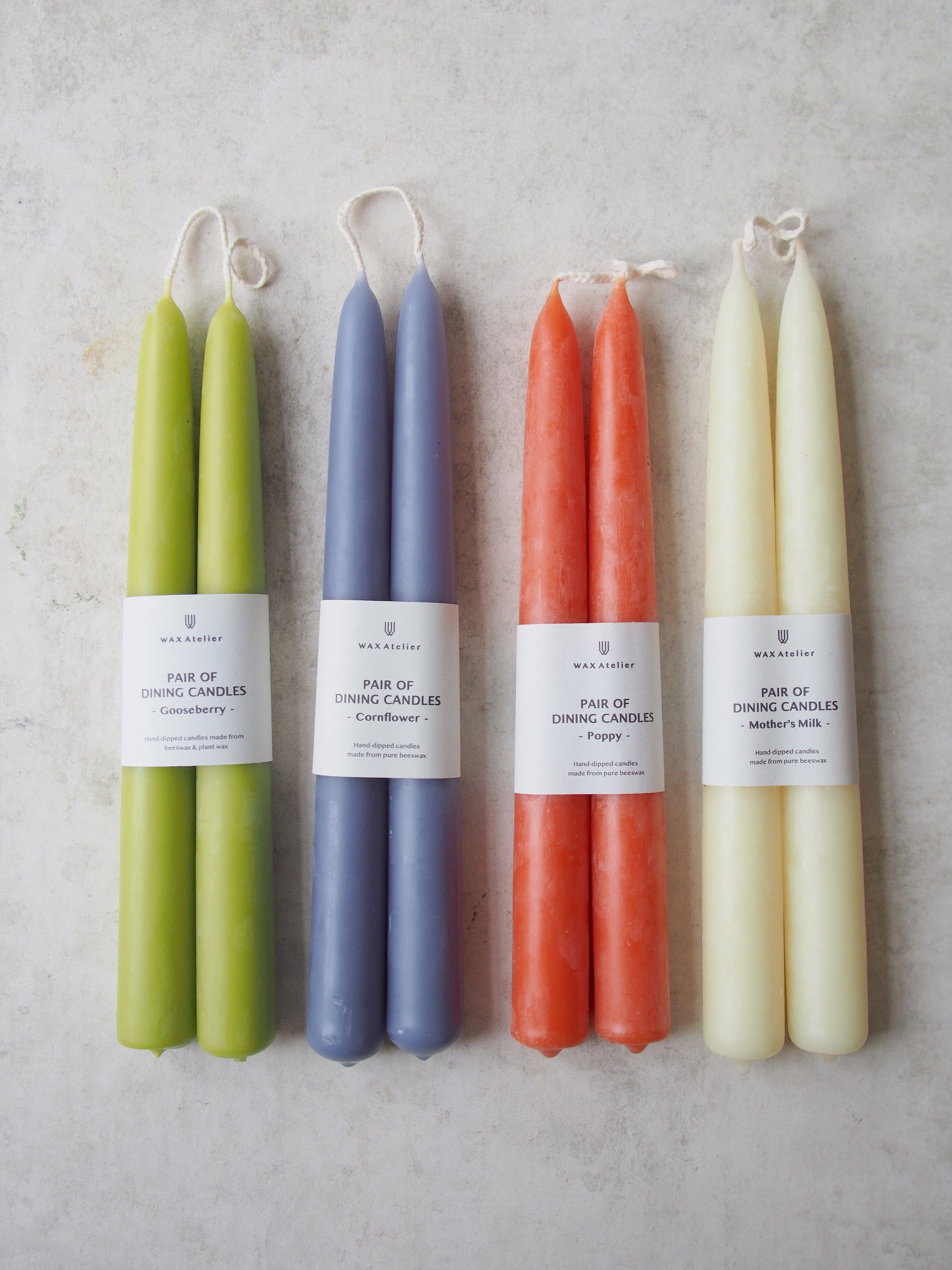 A pair of hand-dipped and naturally dyed beeswax dining candles in your choice of 'Gooseberry' green, 'Cornflower' blue ‘Poppy' red, or 'Mother's Milk',. Handmade in London by Wax Atelier.