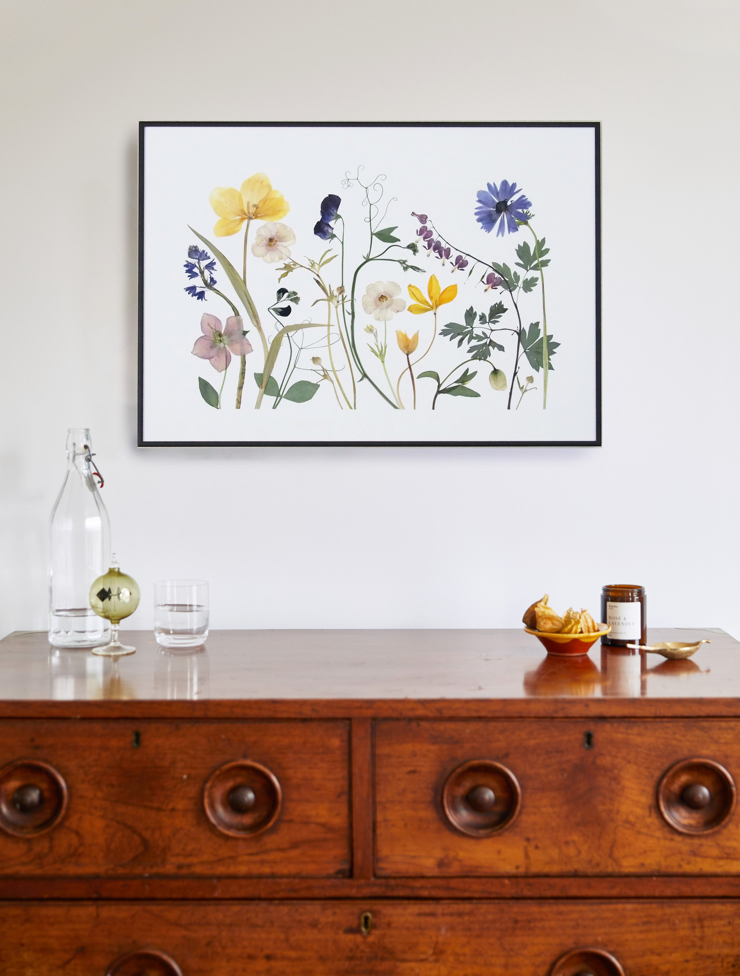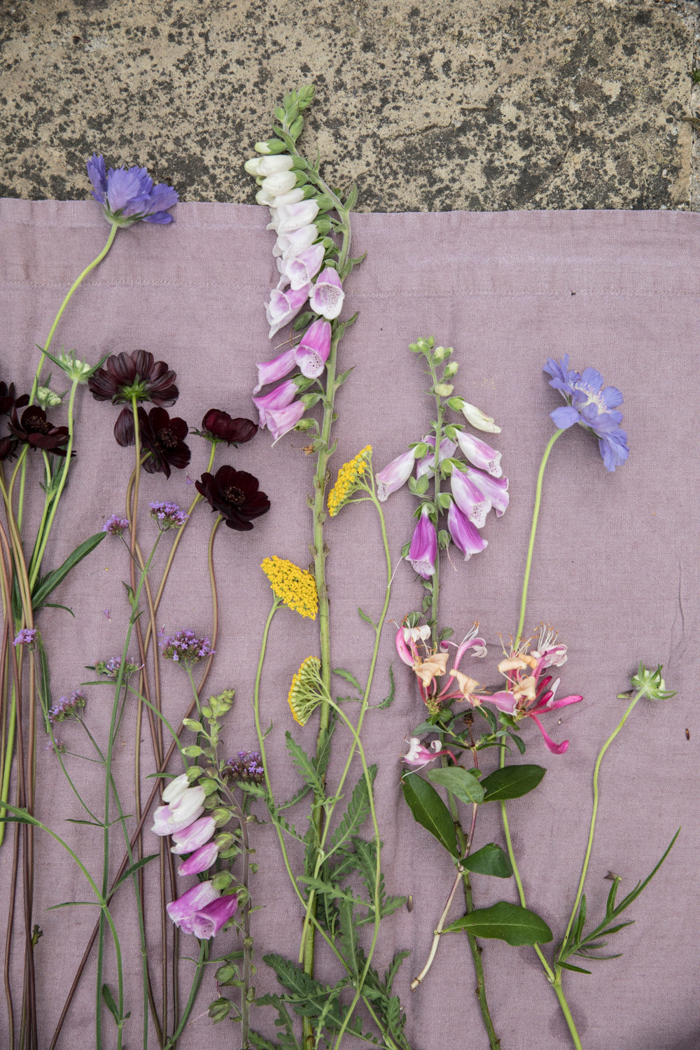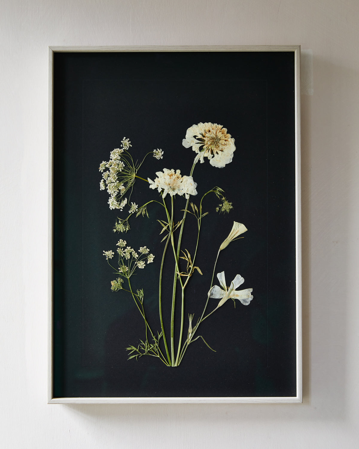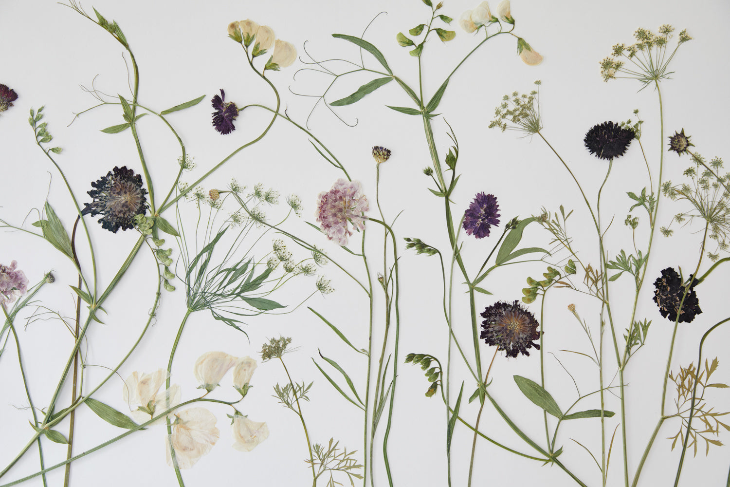 Delicate flowers with a flat petal structure and a slender stem will press best. Umbellifers such as ammi majus, grasses in all varieties, along with climbing and trailing plants such as sweet peas, jasmine and clematis, all add movement and interest to a composition. We avoid larger, juicier flower varieties with complex petal structures, such as garden roses and peonies, as they do not press well, along with some varieties of white flowers which can discolour in the press.