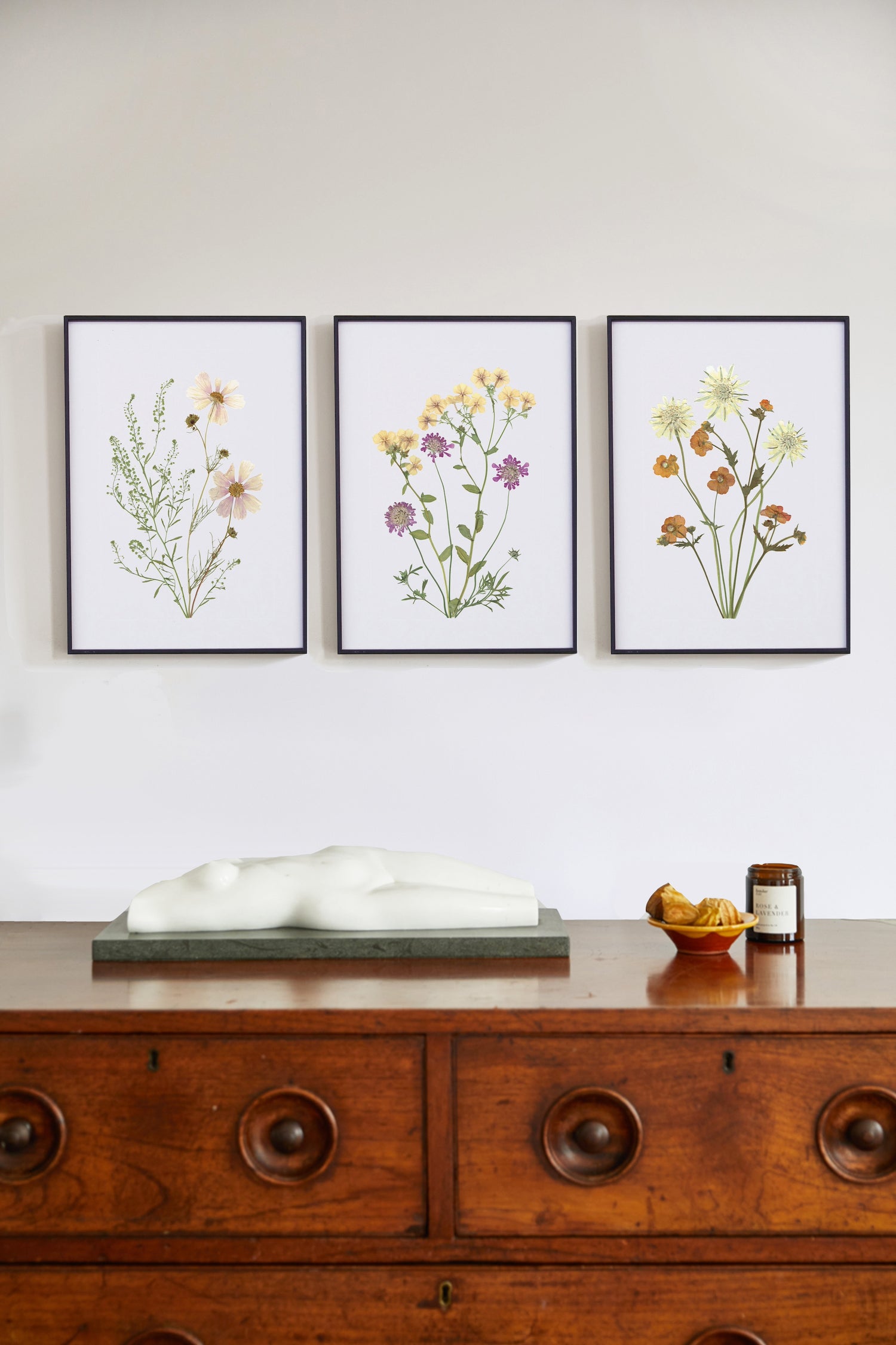 A selection of your wedding flowers, pressed and mounted individually in a series. Each specimen is composed within a subtle scored border on a white or black mount. Calligraphy of the flower name is included and bespoke calligraphy is available on request.